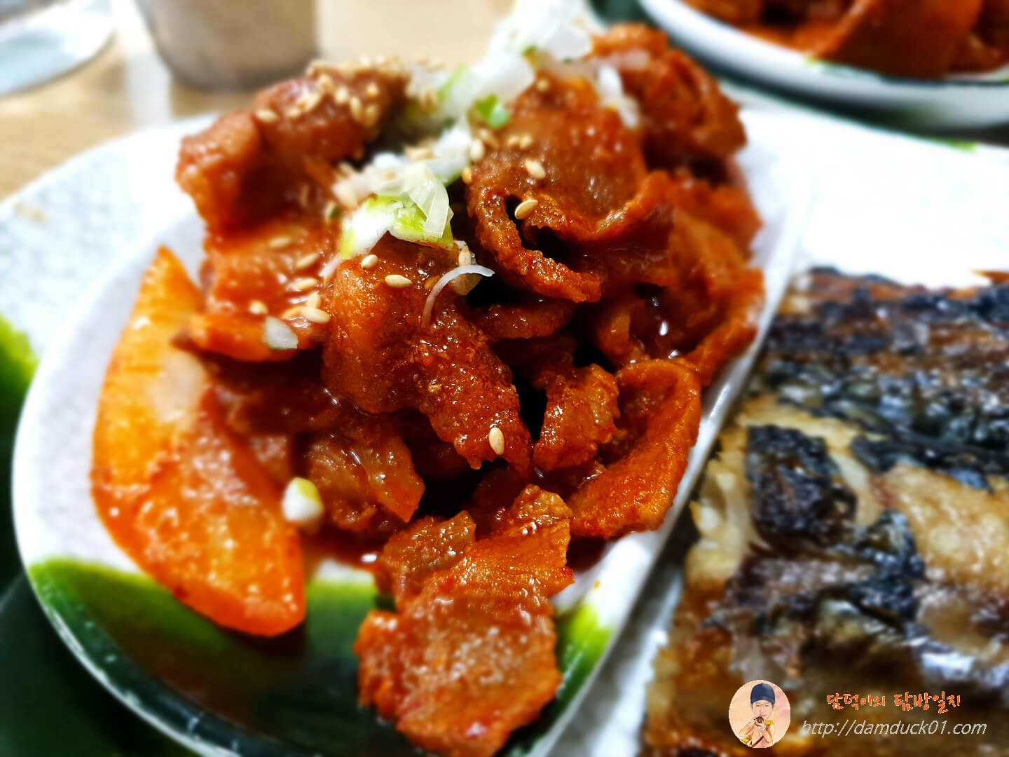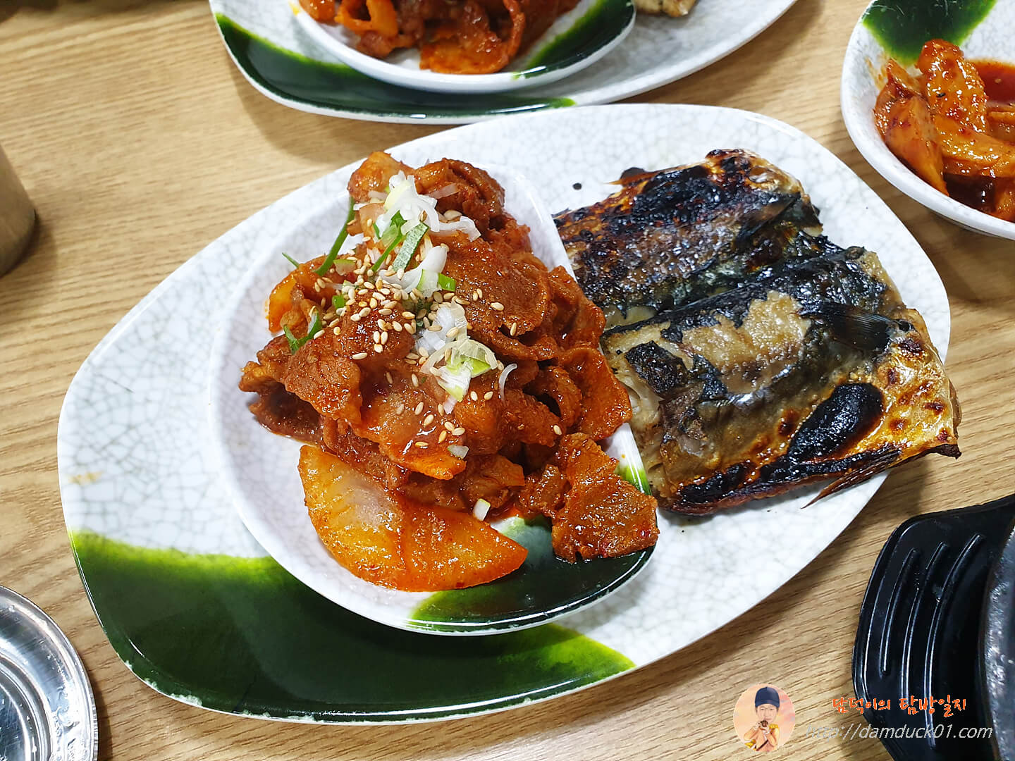 그리고 여수 식당 정식의 남은 두 가지 음식은 고추장 불고기와 고등어구이인데 이렇게 개인당 접시에 나오는데 역시 이 가격에 고등어 한 마리는 아니었습니다. 고등어 한 조각이었어요.