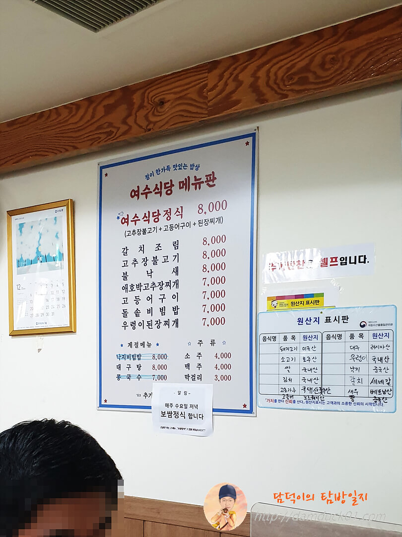 여수식당의 메뉴판을 보면 백반집이라고 해서 매일 새로운 구성으로 나오는 게 아니고 딱 정해진 메뉴가 있는 식당입니다. 여수 식당 정식이라는 메뉴가 8,000원인데 와~ 고추장 불고기, 고등어구이, 된장찌개 구성이라고 적혀 있는데 일단 적힌 것만 봐서는 꽤 가성비가 좋게 느껴집니다.