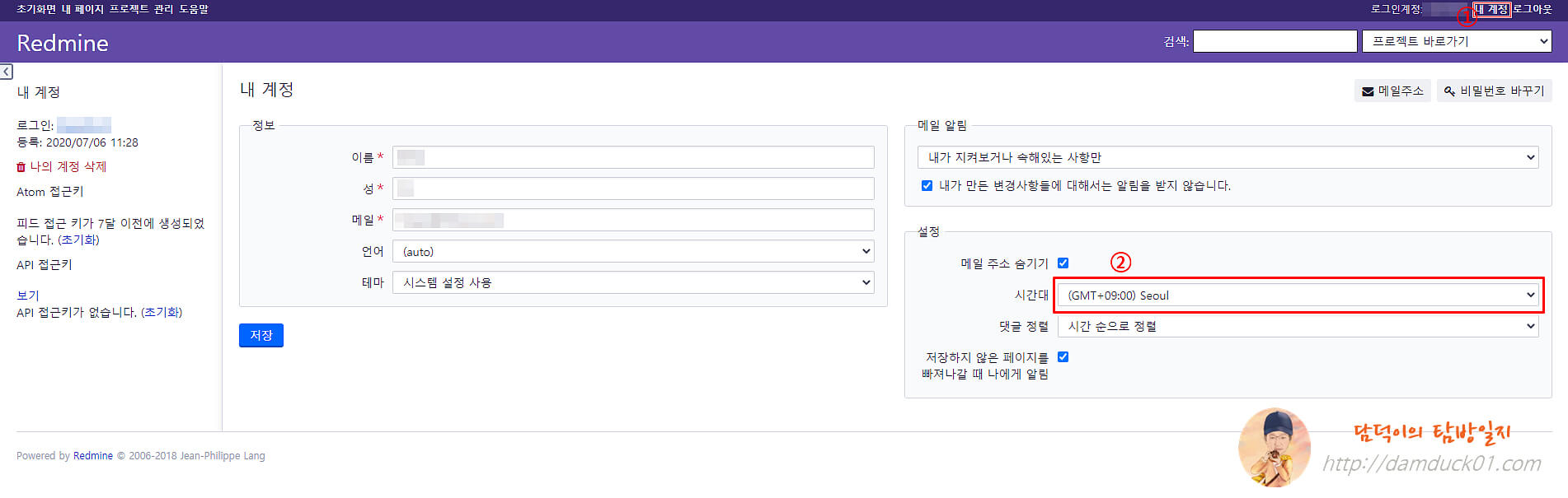 여기서 내가 있는 곳의 시간대를 설정하고 저장을 하면 레드마인의 모든 시간 정보가 내가 설정한 시간대로 표시되는 걸 알 수 있습니다.