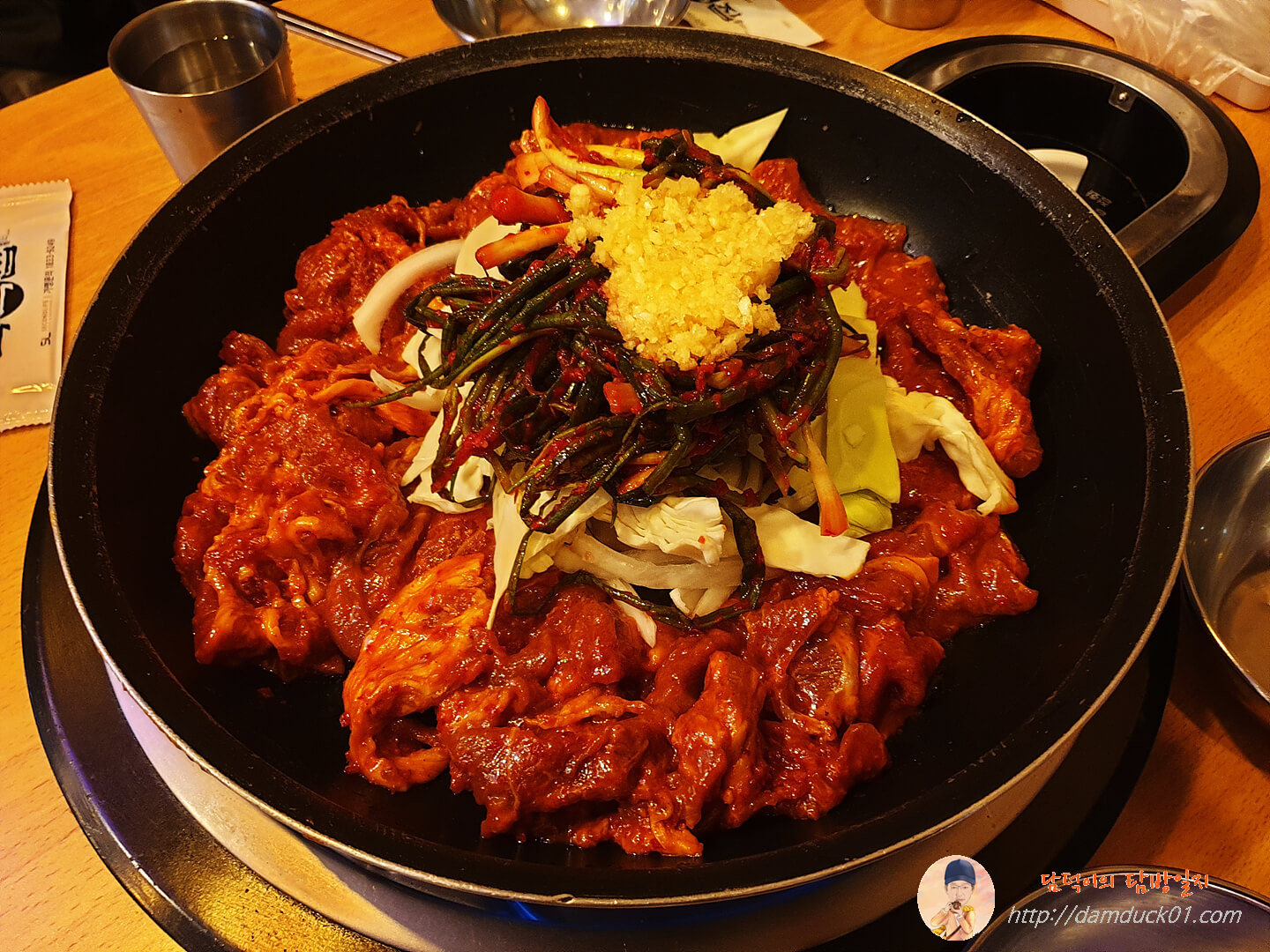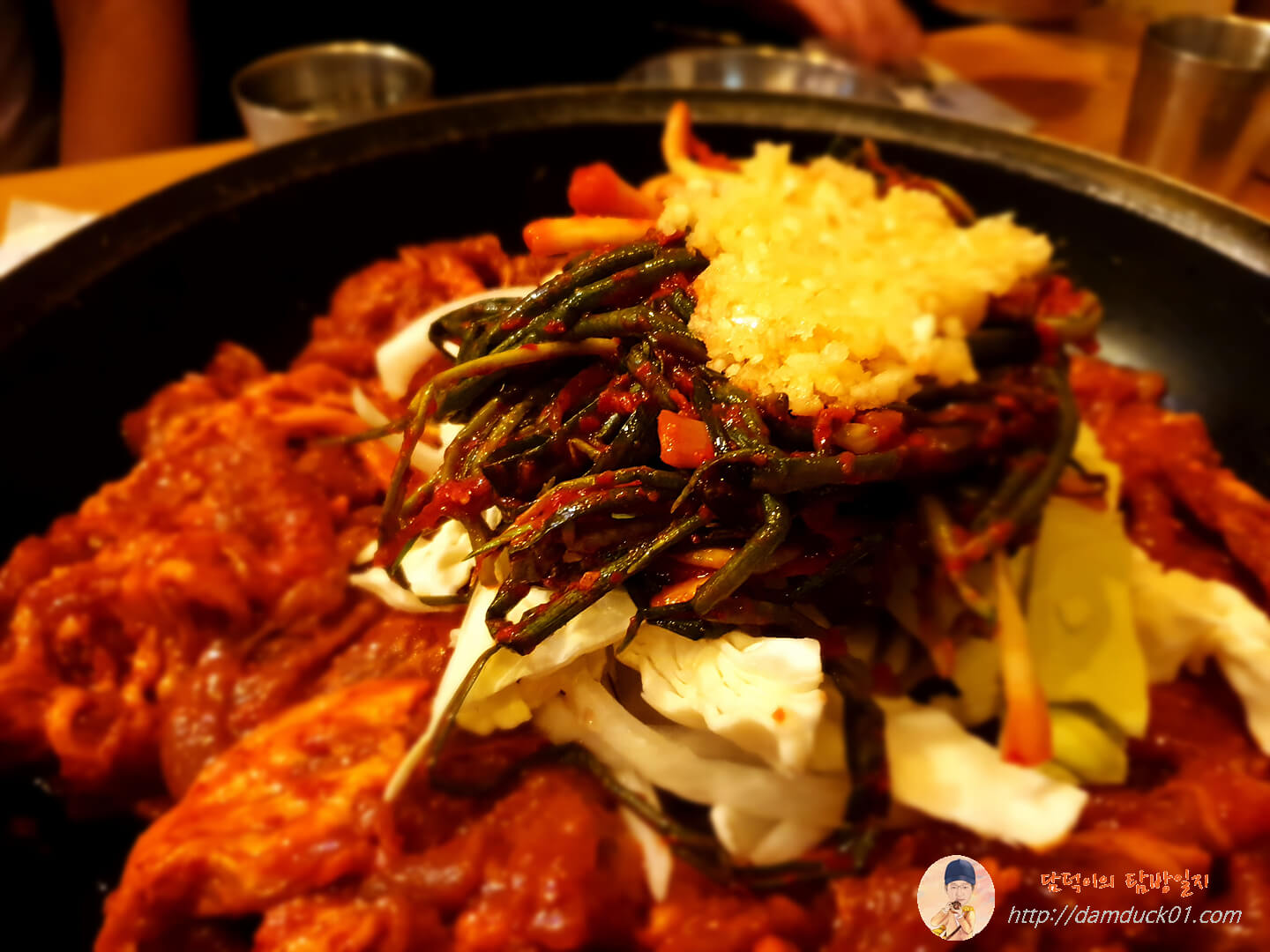 주물럭 위에 양배추와 파김치 그리고 다진 마늘이 수북하게 올려져 있어요.