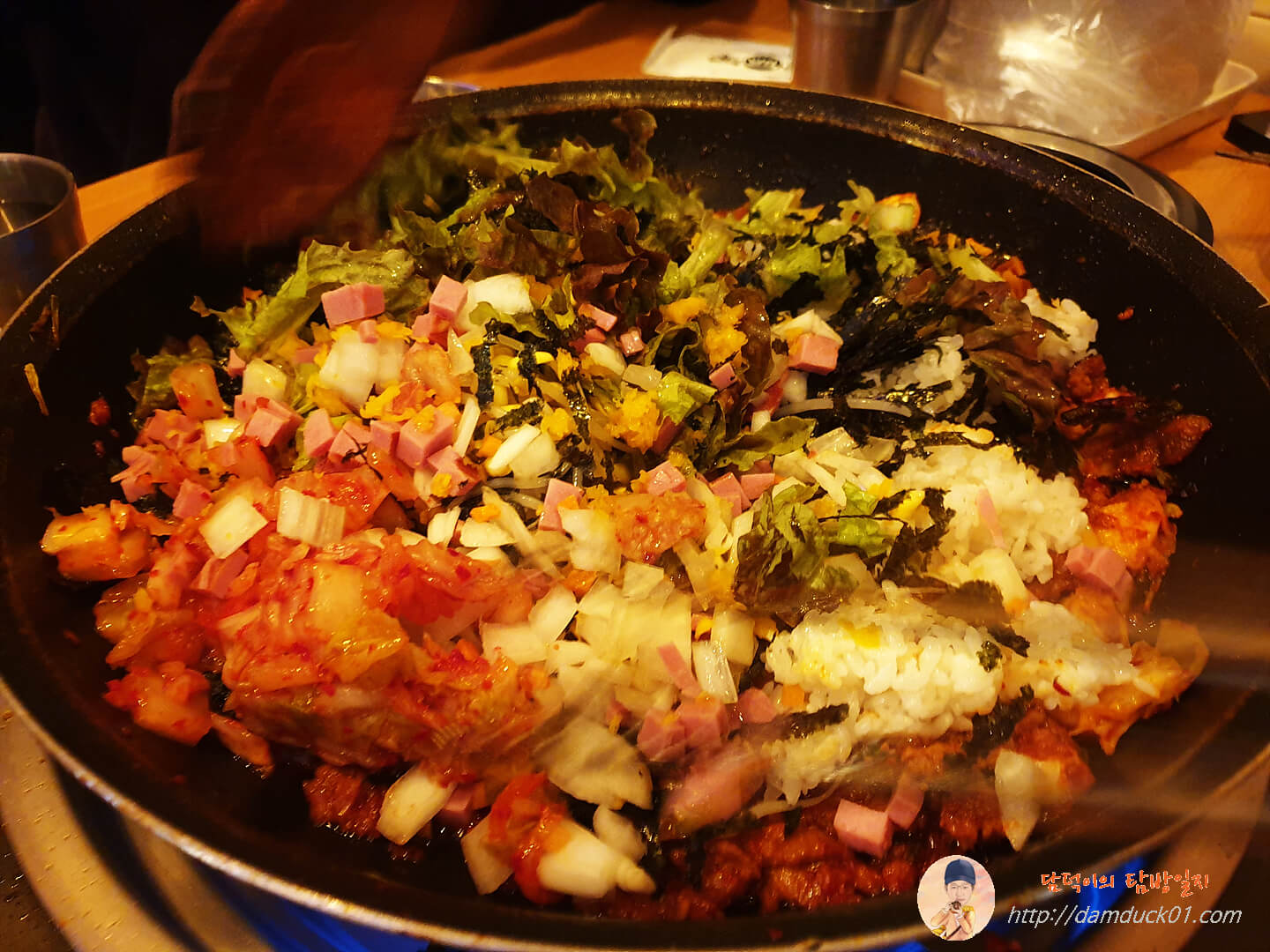 남아 있는 주물럭 위에 밥을 담아 주고 그 밥 위에 가지고 온 볶음밥 재료를 다 쏟아준 후 센 불에 빠르게 볶기 시작합니다.