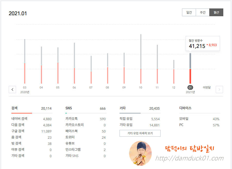 구글이 공과 사를 구별해서 이번 달에는 담덕이의 탐방일지 글 노출이 잘 되길 바라며 2021년 1월 월간 인기 글을 알아보겠습니다.