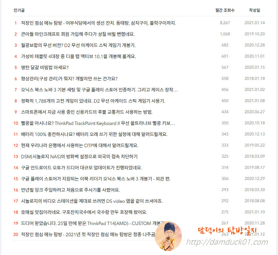 구글이 공과 사를 구별해서 이번 달에는 담덕이의 탐방일지 글 노출이 잘 되길 바라며 2021년 1월 월간 인기 글을 알아보겠습니다.