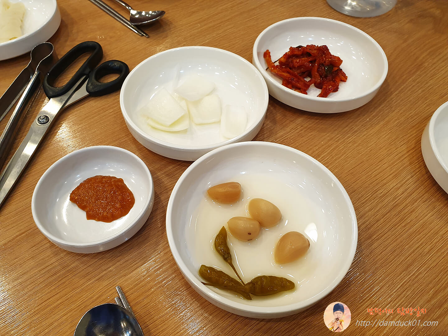 배추김치와 깍두기는 이렇게 덜어 먹을 수 있도록 별도의 그릇과 함께 준비가 되었습니다. 집게로 집고 가위로 싹둑싹둑, 먹을 준비를 마치고 나면