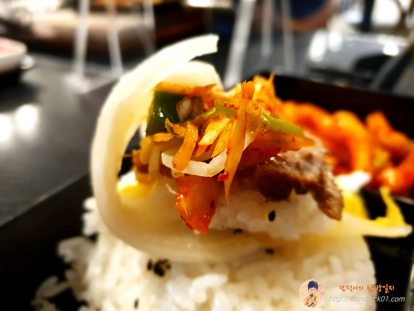 먼저 밥 위에 보쌈 고기 하나 올리고 무김치, 파채, 콩나물, 젓갈 살짝 올려서 먹으면 제 입을 쌈이라 생각하고 먹을 수 있는 방법이고요.