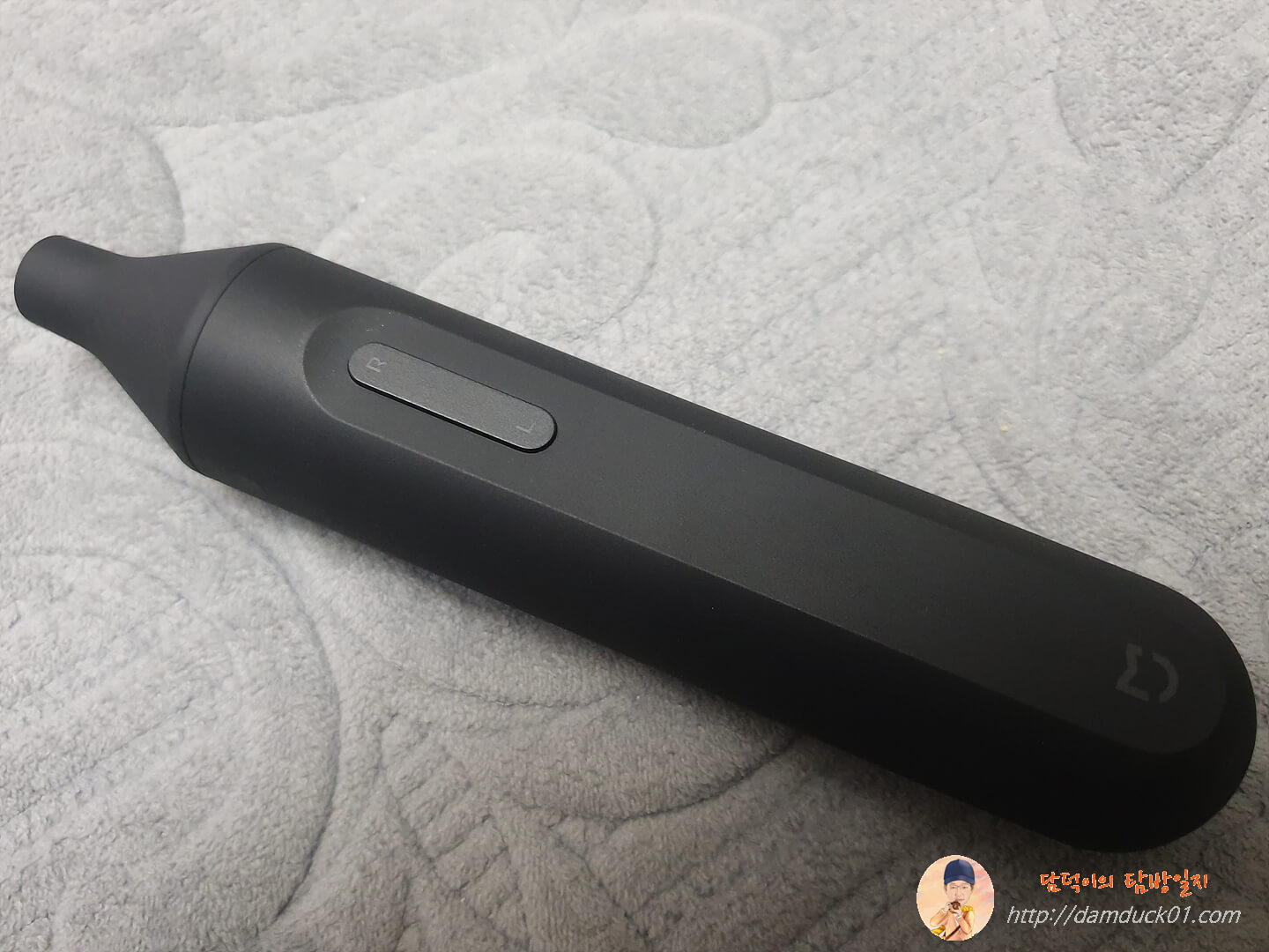 블랙 무광의 깔끔한 재질의 드라이버입니다. 버튼은 회전 방향이 적혀 있는 두 개의 클릭 버튼이 위아래로 배치되어 있고 하단에 미지아 로고가 흐릿하게 인쇄되어 있네요.