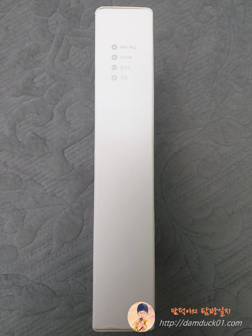 상자 측면에는 비트에 대한 설명이 적혀 있는데 솔직히 뭘 뜻하는 용어인지 모르겠더라고요. 그래서 검색을 해 봤는데 십자드라이버의 사이즈를 표시하는 규격은 PH라고 한다네요. PH00부터 시작해서 PH0, PH1, PH2, PH3 이런 식으로 커진다고 합니다. H로 표시한 건 육각 비트의 규격 단위이고요. 그런데 일자 드라이버는 보통 팁의 길이로 표시하거나 SL이라는 규격으로 표시되어 있는데 그렇다고 해도 PH1이 어느 정도고 PH2가 어느 정도인지 전혀 감이 안 오죠. 그냥 실제로 보고 꽂아 봐서 맞네 싶으면 사용하는 거죠. ㅋ