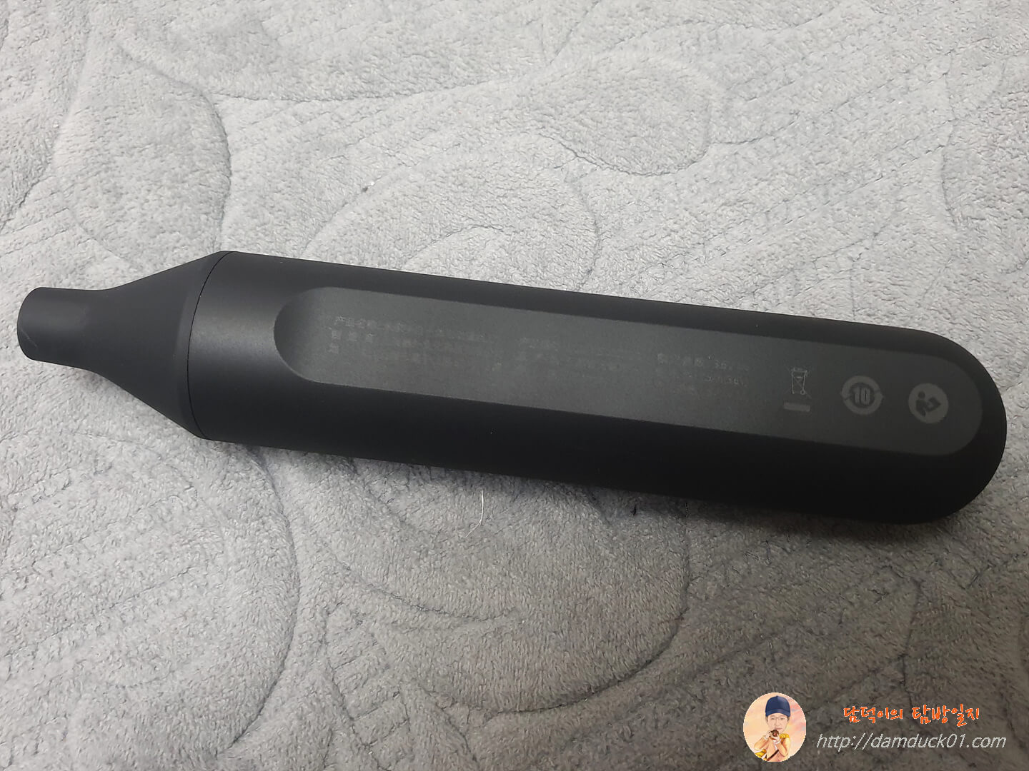 뒷면에는 뭔가 잔뜩 적혀 있는데 흐릿해서 읽기가 힘들어요. 그리고 편한 그립을 위한 설계인지 모르겠는데 앞쪽 버튼이 있는 부분과 여기 한자가 적혀 있는 부분이 평평하게 파여 있는데 실제 쥐어보면 두께에 비해 편하게 쥐고 작업할 수 있어서 좋습니다.