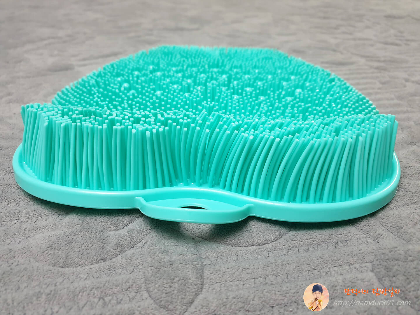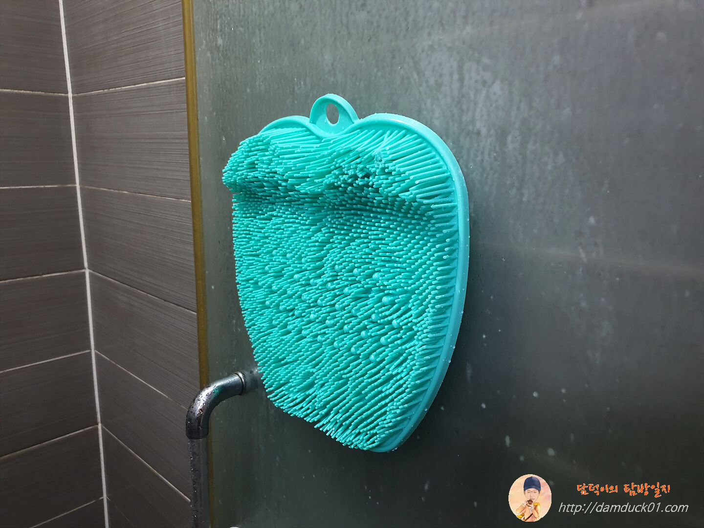 바닥에는 미끄럼 방지 흡착판이 있는데요. 발을 씻기 위해 바닥에 두고 발을 문질러야 하는데 그때 미끄러지면 안 되니까 미끄럼 방지를 위한 기능도 하고 욕실에 보관을 할 때 벽에 붙여서 보관을 하는 용도로도 사용합니다. 상단에 고리 역시 보관용으로 사용하는 용도고요.
