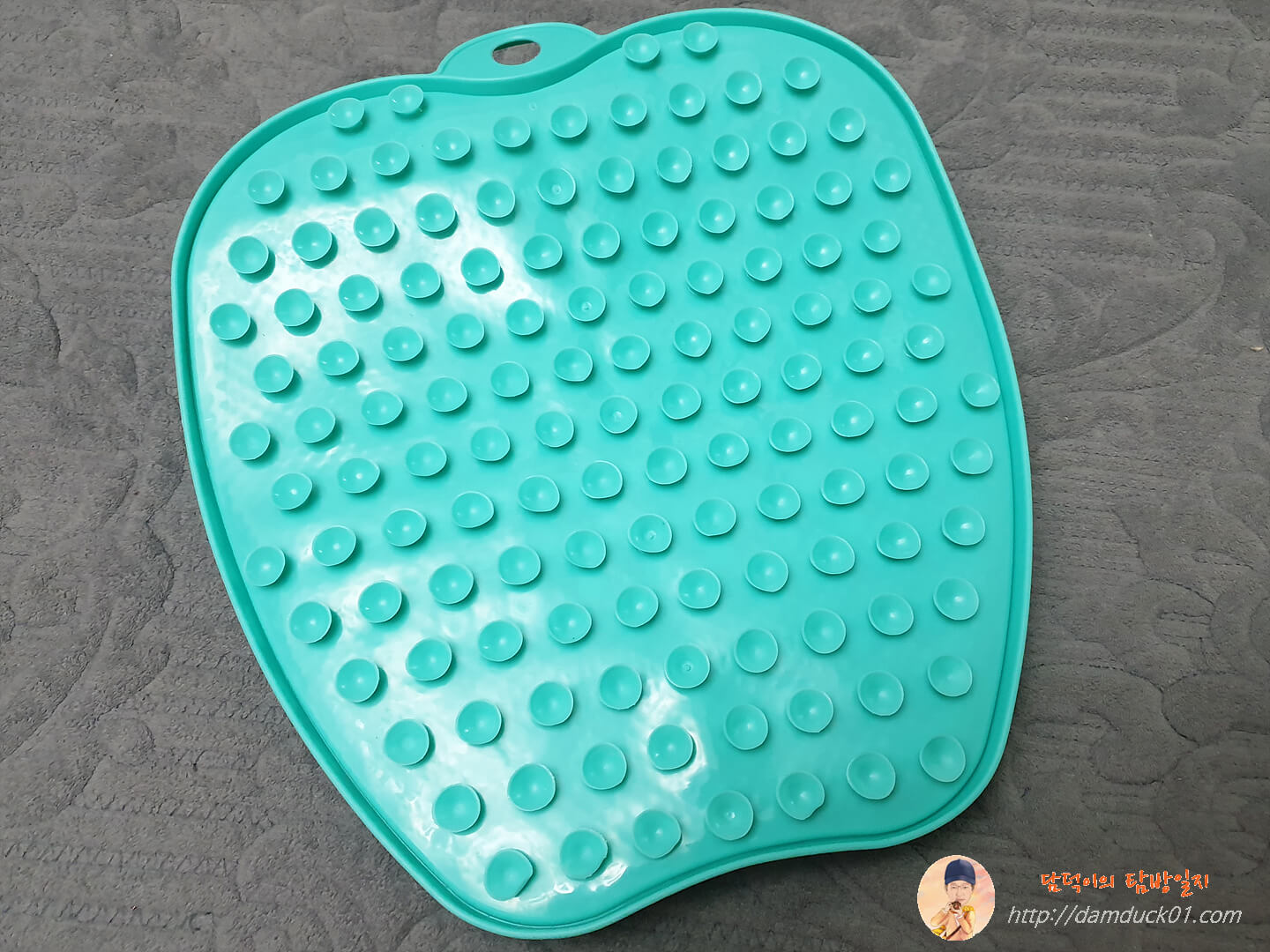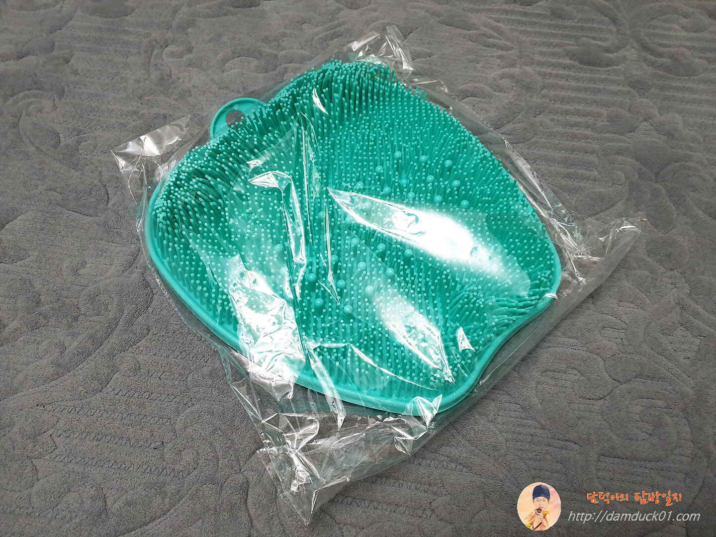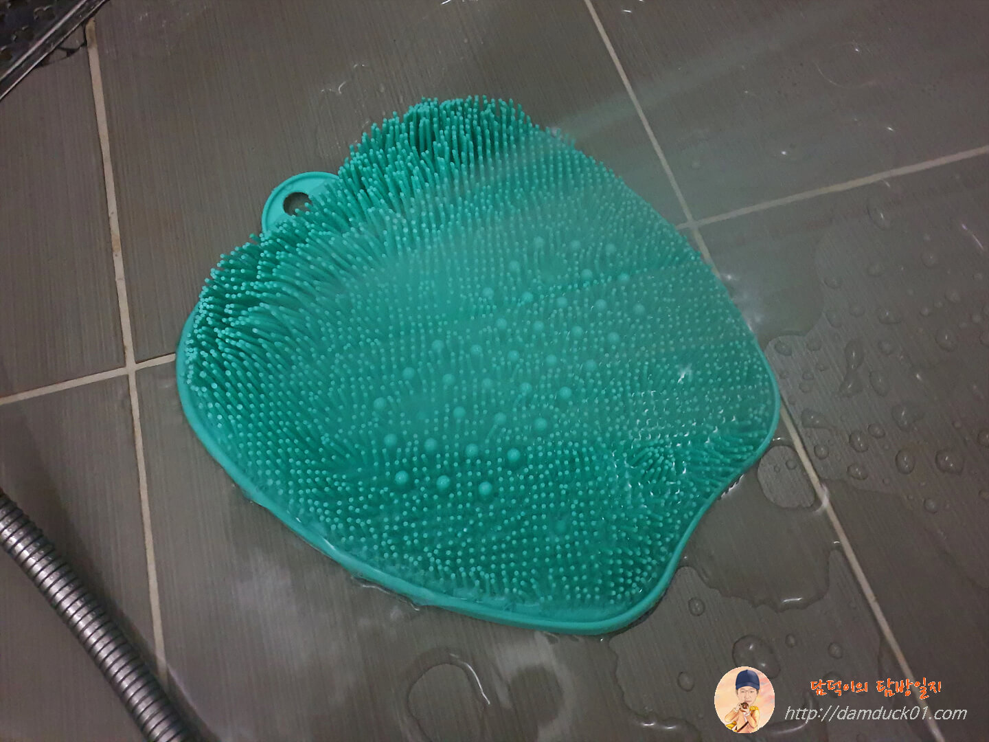 바닥에는 미끄럼 방지 흡착판이 있는데요. 발을 씻기 위해 바닥에 두고 발을 문질러야 하는데 그때 미끄러지면 안 되니까 미끄럼 방지를 위한 기능도 하고 욕실에 보관을 할 때 벽에 붙여서 보관을 하는 용도로도 사용합니다. 상단에 고리 역시 보관용으로 사용하는 용도고요.