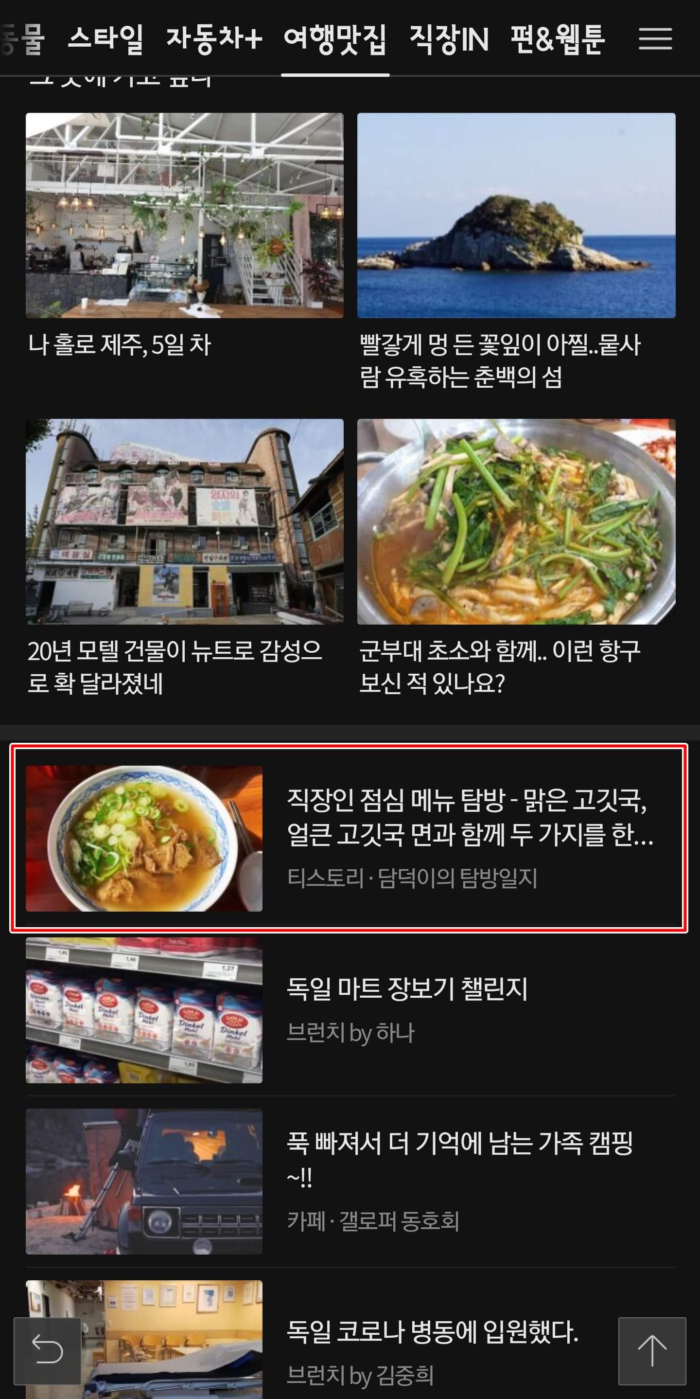 이렇게 다음 모바일 사이트의 여행맛집 채널은 캡처 성공, 다음 메인에 등록된 포스트는 어제 아침에 발행한 오한수 우육면가의 우육탕면 포스트입니다. 오랜만에 찾은 오한수 우육탕면인데 이렇게 행운을 가져다주네요. 조금 더 자주 가서 점심을 먹어야 할까요?