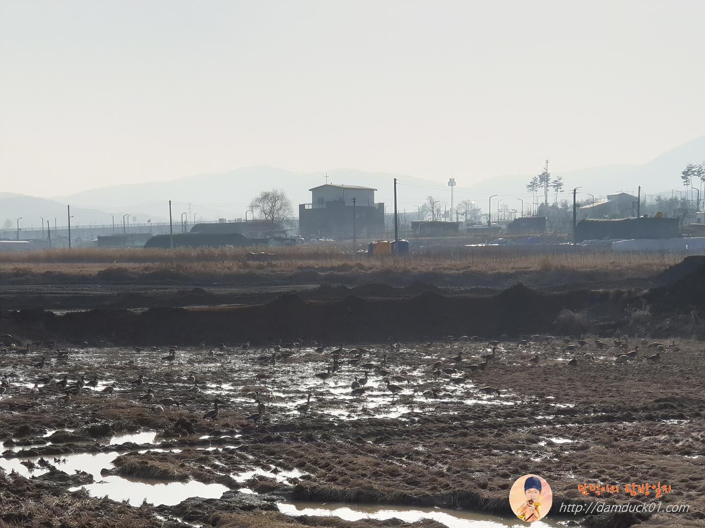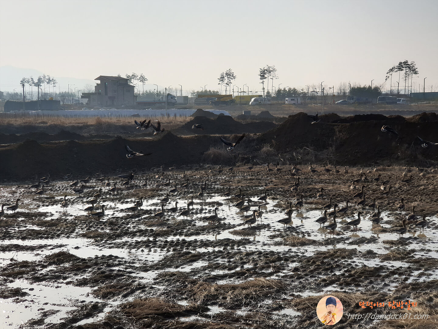그 넓은 중간에는 날아다니는 오리 떼가 많이 보이고요.