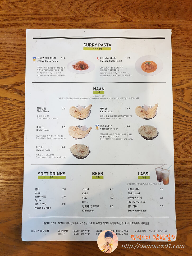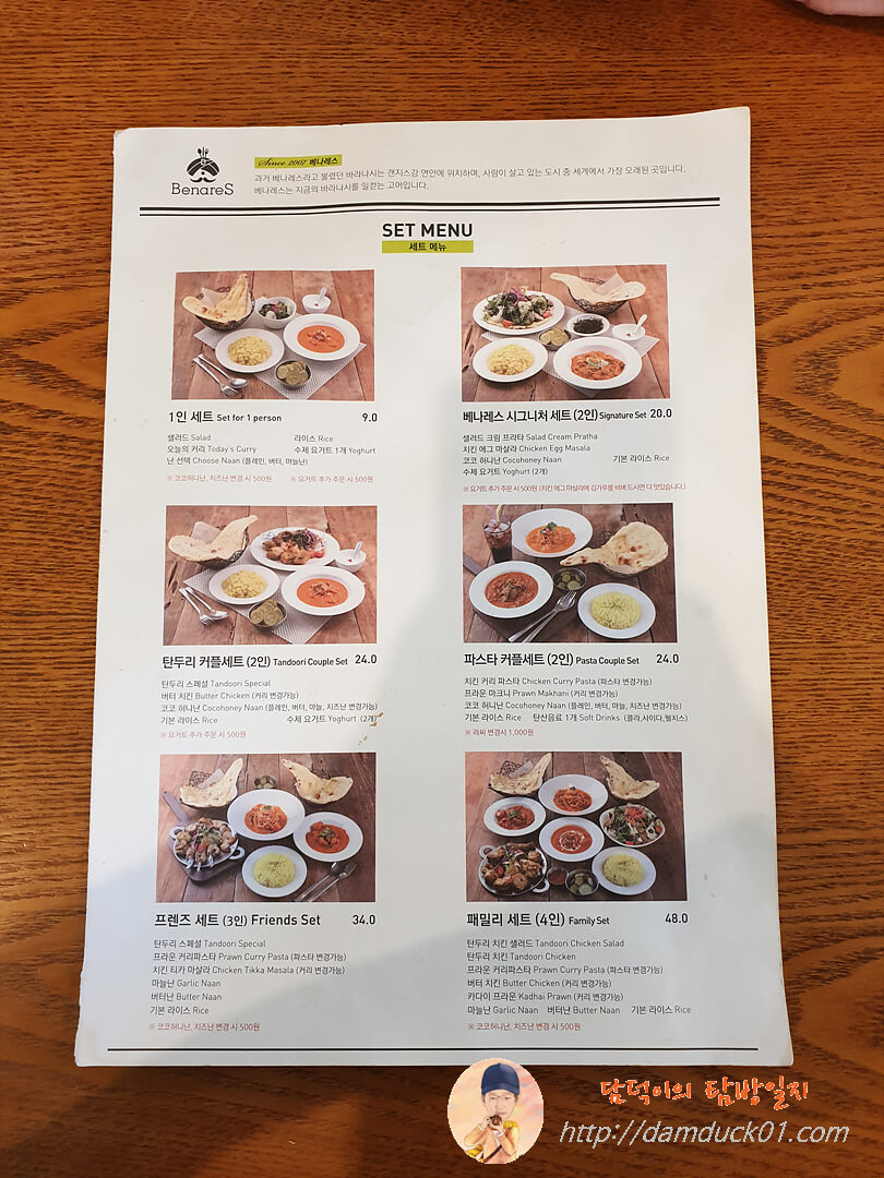 베나레스의 메뉴판을 보면 이렇게 세트 메뉴가 있는데 뒤에 커리 단품 가격보다 1인 세트가 더 저렴하더라고요.