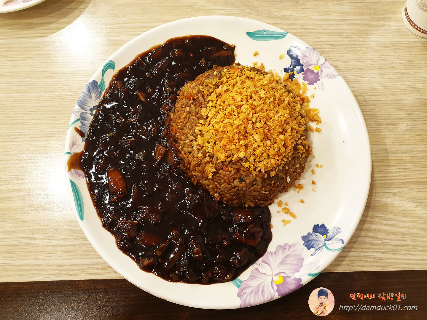 중국집에서 흔히 볼 수 있는 볶음밥 구성이긴 한데 밥 색깔이 어두운 갈색이라는 점과 볶음밥 위에 뿌려져 있는 튀김 가루가 시선을 사로잡습니다.