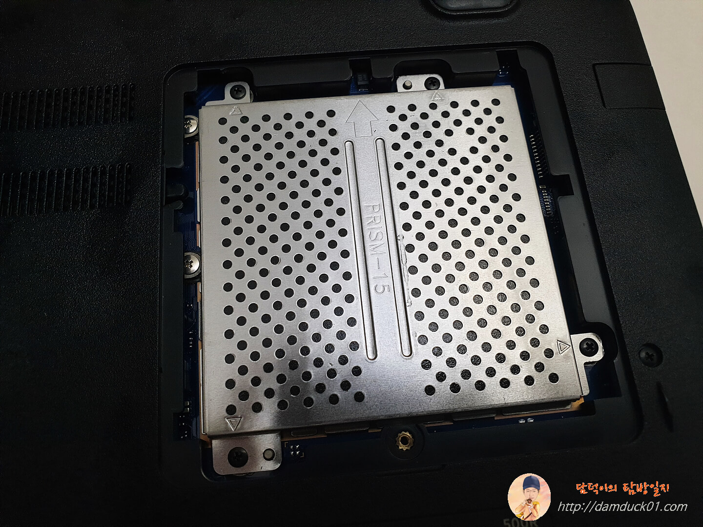 그렇게 겨우 메모리 슬롯을 열었는데 어라 여기 이런 덮개가 하나 더 덮여 있네요. 열을 식혀주는 용도인 걸까요? 여기도 작은 나사가 4개나 결합되어 있는데 하~ 겨우 찾은 드라이버로 힘들게 분해를 하긴 했는데 하나가 안 돌아갑니다. 드라이버가 살짝 크다 싶더니 나사 하나가 헛돌아요.