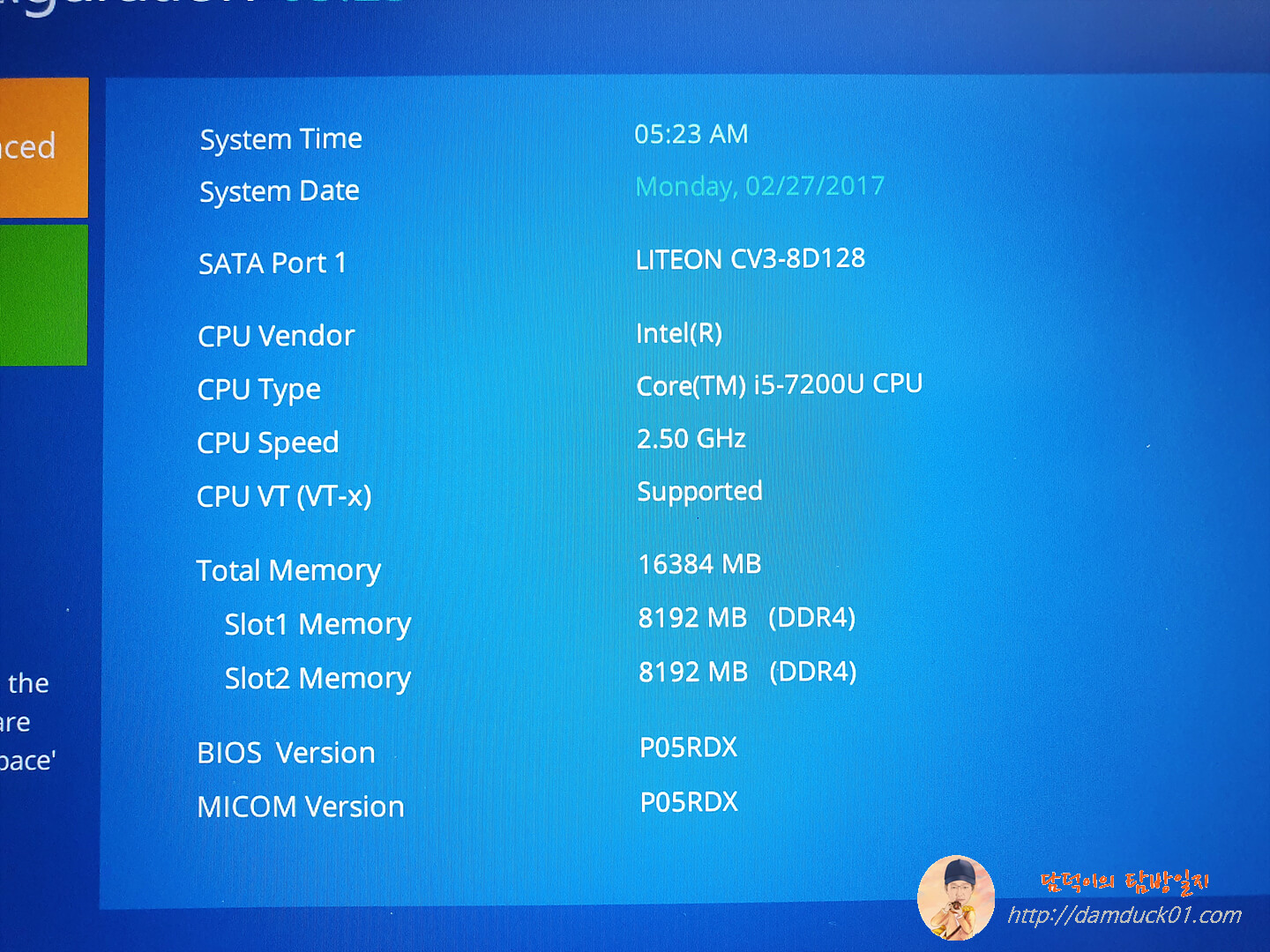 프리도스 제품이라 윈도우는 직접 설치해야 합니다. 뭐 복구 영역이 있었다고 하더라도 어차피 프로젝트 투입되었던 노트북이라 나올 때 로우 포맷을 해서 복구 영역까지 다 날아갔을 테지만요. 그래서 일단 메모리가 문제없이 인식이 잘 되었는지는 바이오스로 진입해서 확인을 했습니다. 전체 메모리 16GB 메모리 슬롯 2개의 각각 8GB로 잘 인식이 되었습니다.