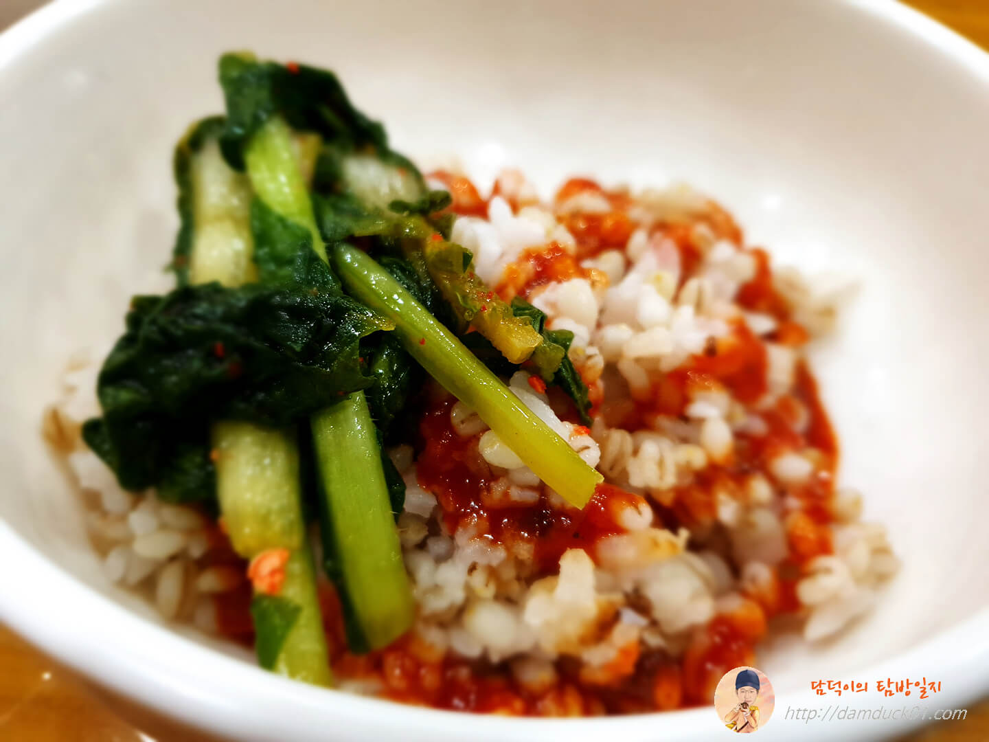 이렇게 보리밥 위에 초고추장을 양껏 뿌려주고 열무를 적당히 덜어서 얹어 주세요.