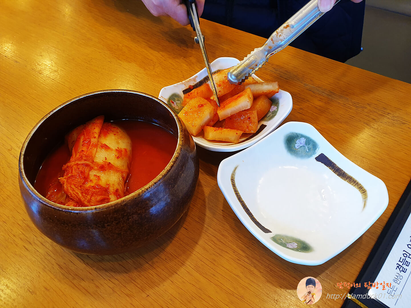 통으로 나온 깍두기와 배추김치는 먹기 좋은 크기로 빈 그릇에 나누어 담아줍니다.