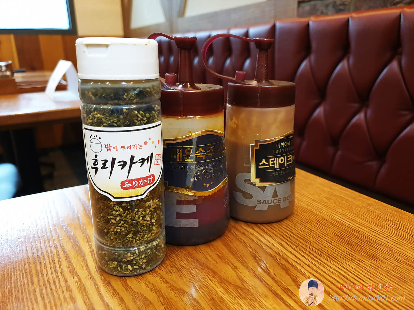 테이블에는 밥에 뿌려먹는 후리카케와 매운 숙주 소스, 스테이크 소스가 준비되어 있고요.