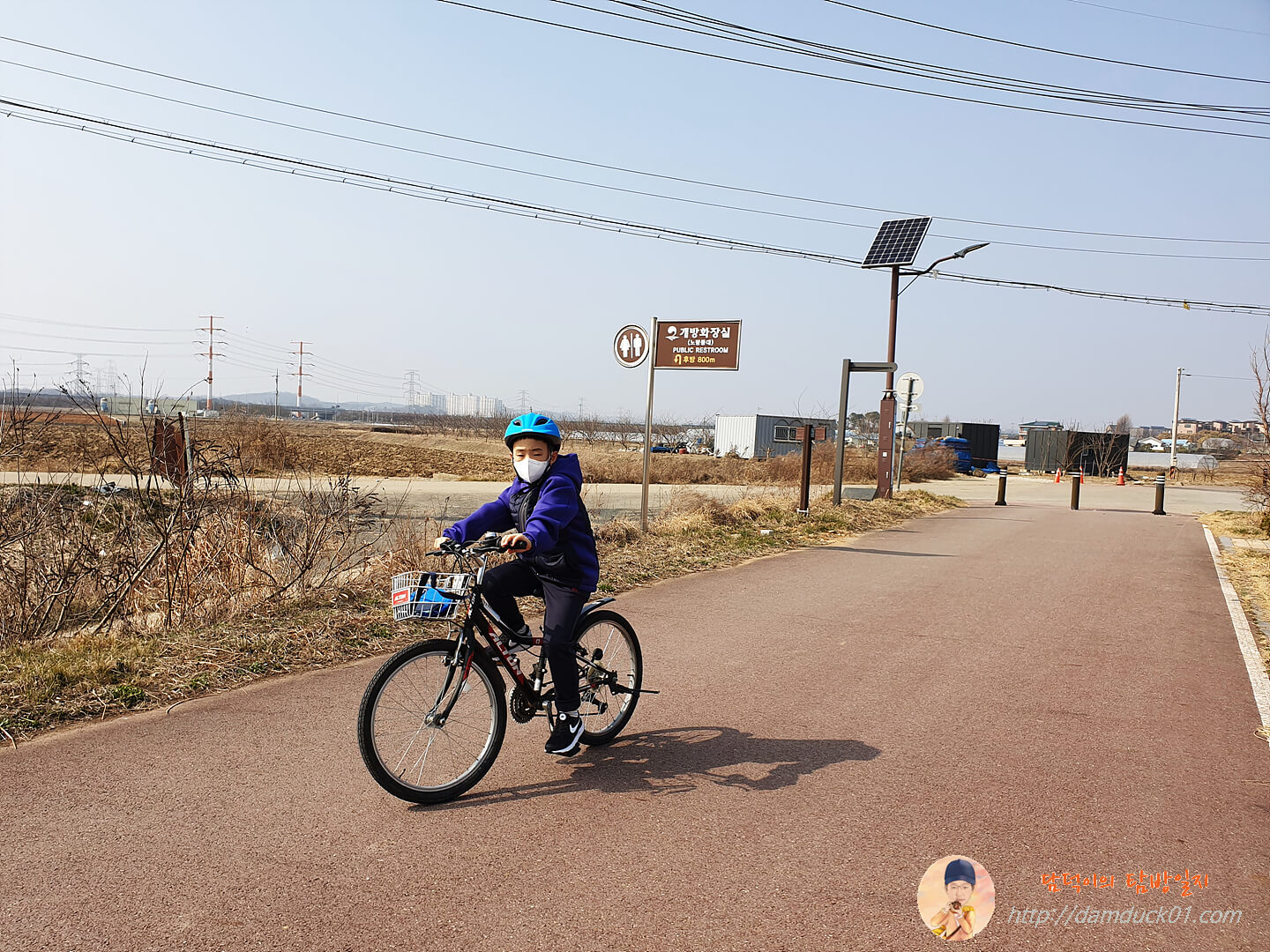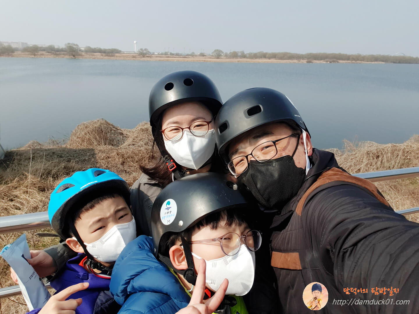 아이들은 평소에도 자전거를 자주 타지만 저랑 아내는 진짜 오랜만에 자전거를 탔는데 자전거 도로는 나름 잘 되어 있는 구간도 있고 신경을 쓴 거 같긴 한데 인도와 명확한 구분이 없고 가는 코스 중간에는 차량을 만나는 구간도 있어서 부모 입장에서는 방심을 하면 안 되겠더라고요. 이런 건 조금 더 개선이 되면 좋을 거 같습니다. 그래도 이렇게 좋은 경치를 보면서 시원한 강바람을 맞으며 달리는 기분은 좋더라고요. 오랜만에 느껴보는 시원함이었습니다.