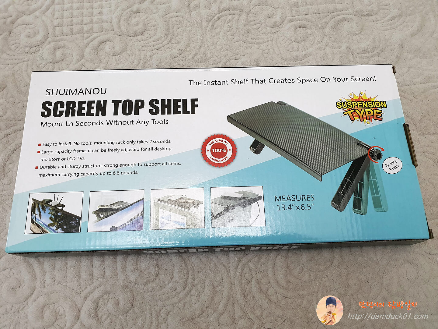 사실 이런 제품은 뭐 대단한 기술이 적용되어 있는 것도 아니고 다이소에서도 흔하게 찾아볼 수 있어요. 자신에게 맞는 사이즈와 가격만 비교하고 편하게 구매하셔도 될 거 같아요. 일단 박스는 저렇게 영어로 제품에 대한 설명이 적혀 있고 옆면에는 SCREEN TOP SHELF라는 문구만 적혀 있습니다.