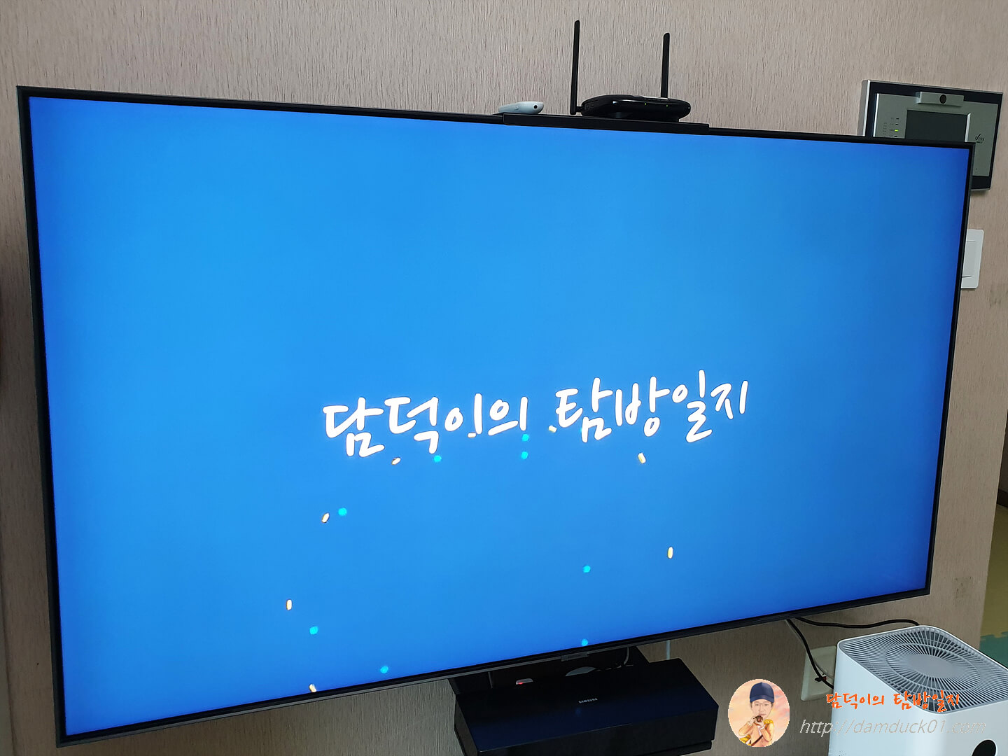 지금 TV 밑에 있는 안테나 앞으로 숙인 저 공유기를 TV위로 올릴 겁니다. 그리고 공유기 안테나도 양팔을 하늘을 향해 뻗을 수 있도록 하는 게 작업 목표죠.