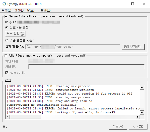 설치를 완료하고 시너지를 실행하면 위와 같은 화면을 볼 수 있는데 일단 메인 PC를 선택해야 합니다. 메인 PC에서 실행한 Synergy 화면에서 Server에 체크를 하고 서버 설정을 클릭합니다.