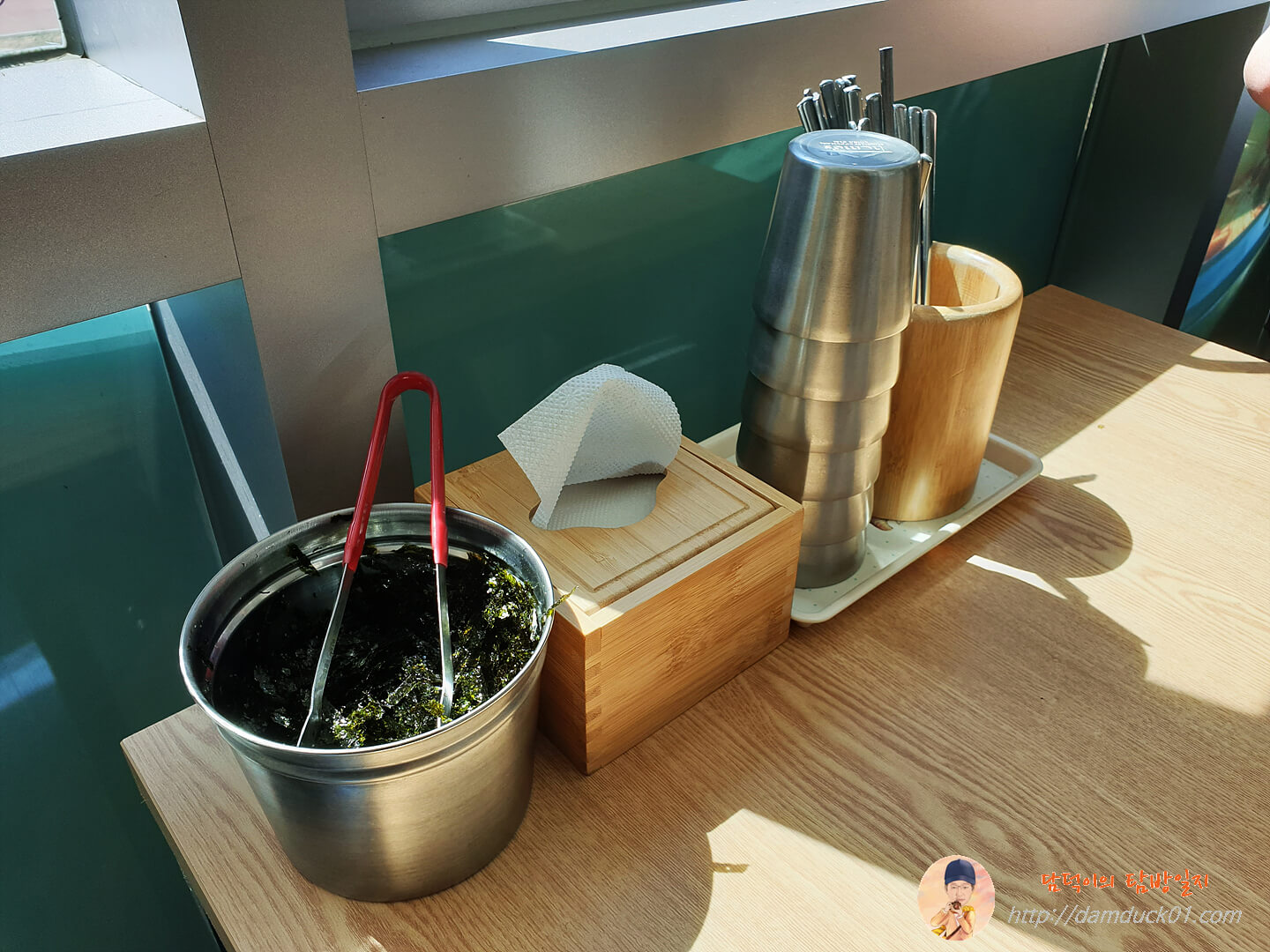 테이블에는 수저와 물컵, 휴지 그리고 김가루가 준비되어 있었어요.