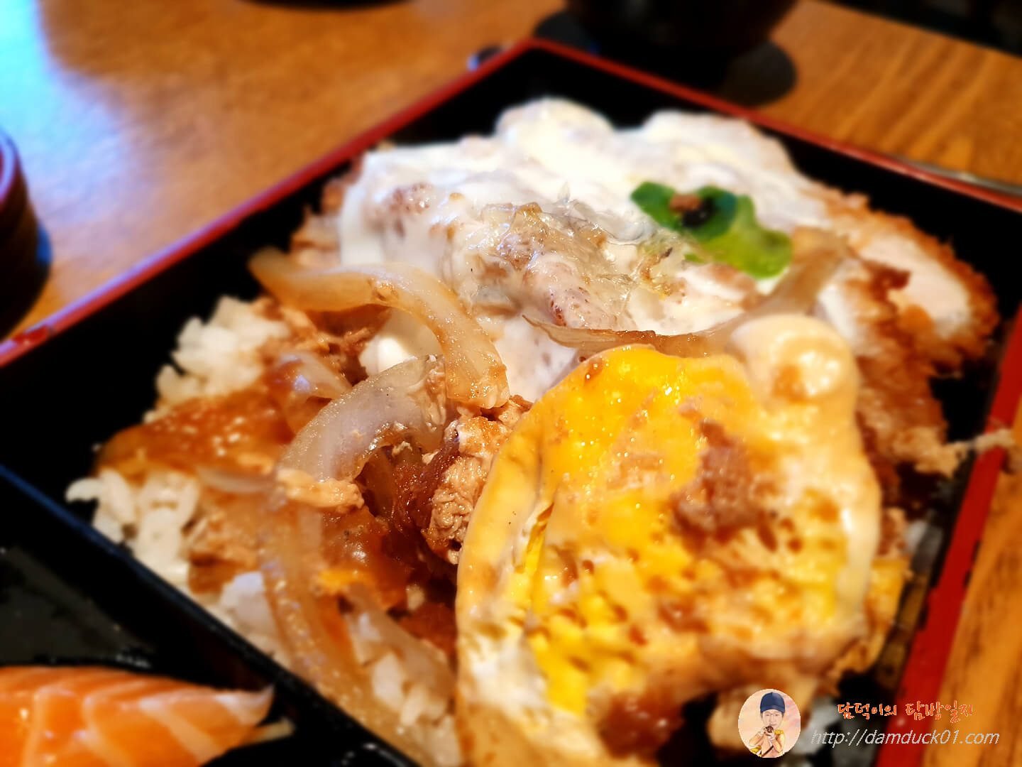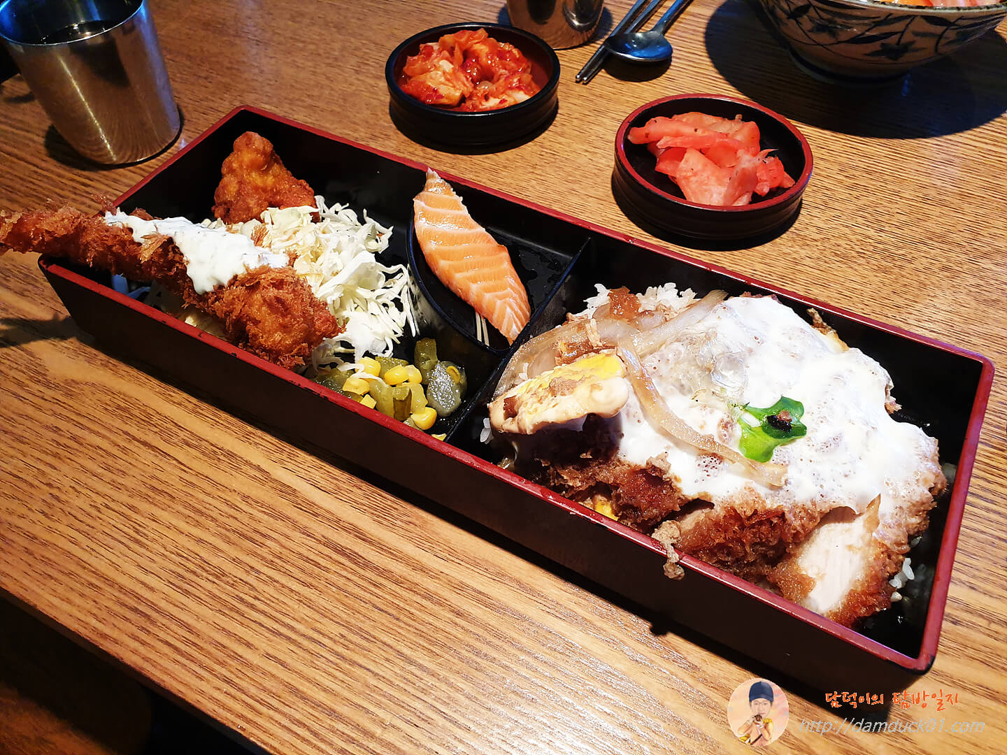제가 주문한 가츠동벤또는 가츠동과 새우튀김, 가라아게, 연어까지 제공되는 일종의 모둠 같은 메뉴랍니다.