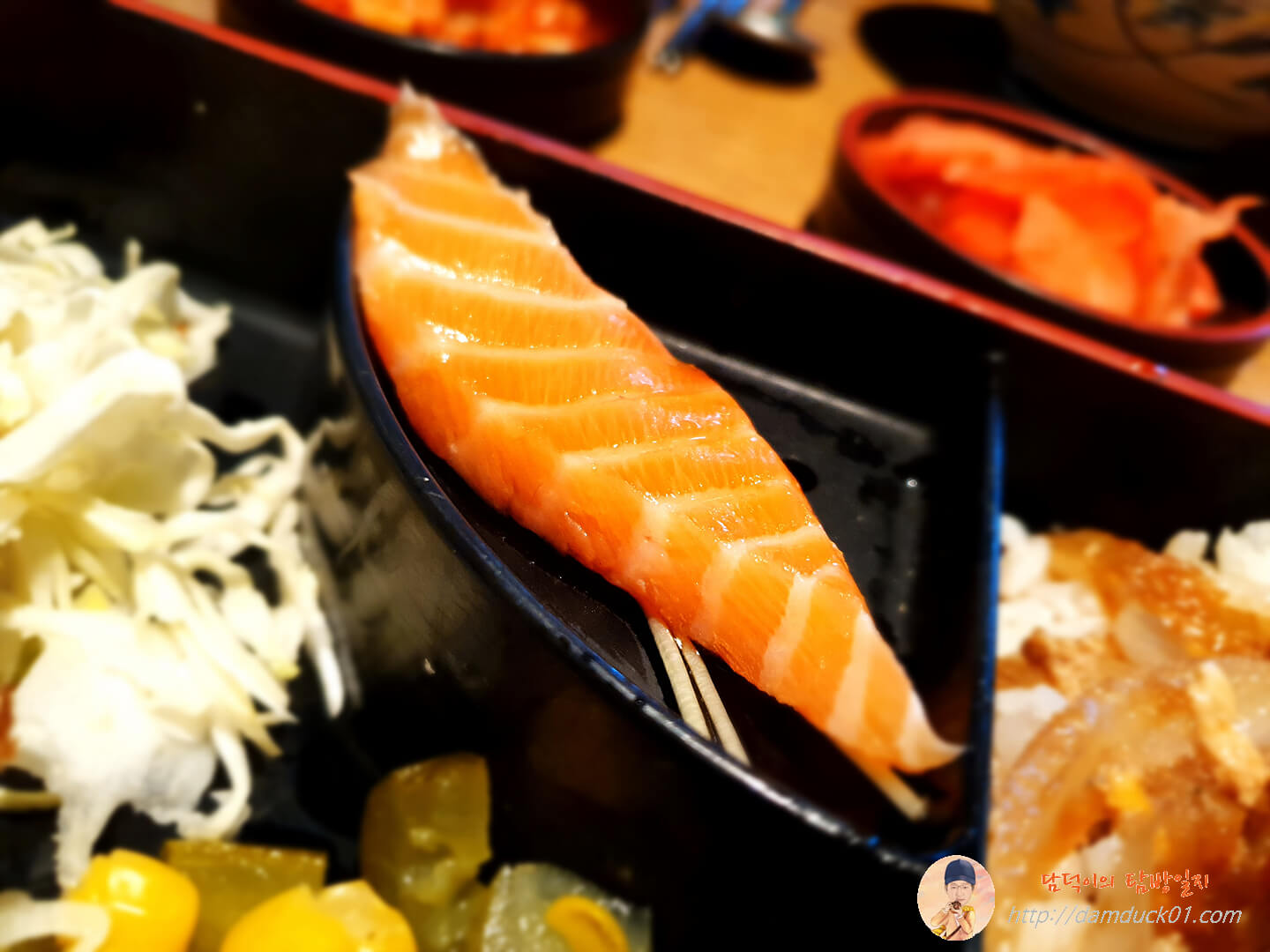 반으로 나뉜 용기에 작은 공간이 있는데 그곳에는 이렇게 연어 1조각이 있네요.