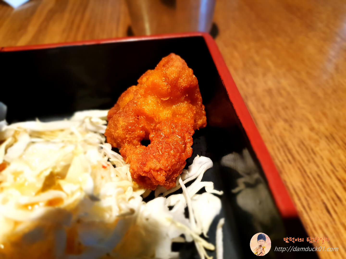 돈가스 밑에는 이렇게 간장 소스가 뿌려진 밥이 있어서 돈가스와 밥을 먹으면서 양배추 샐러드랑 새우튀김, 가라아게, 연어는 반찬처럼 먹었어요.