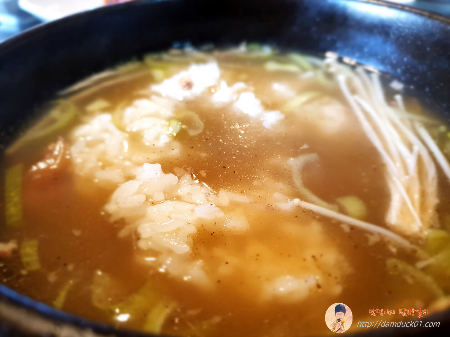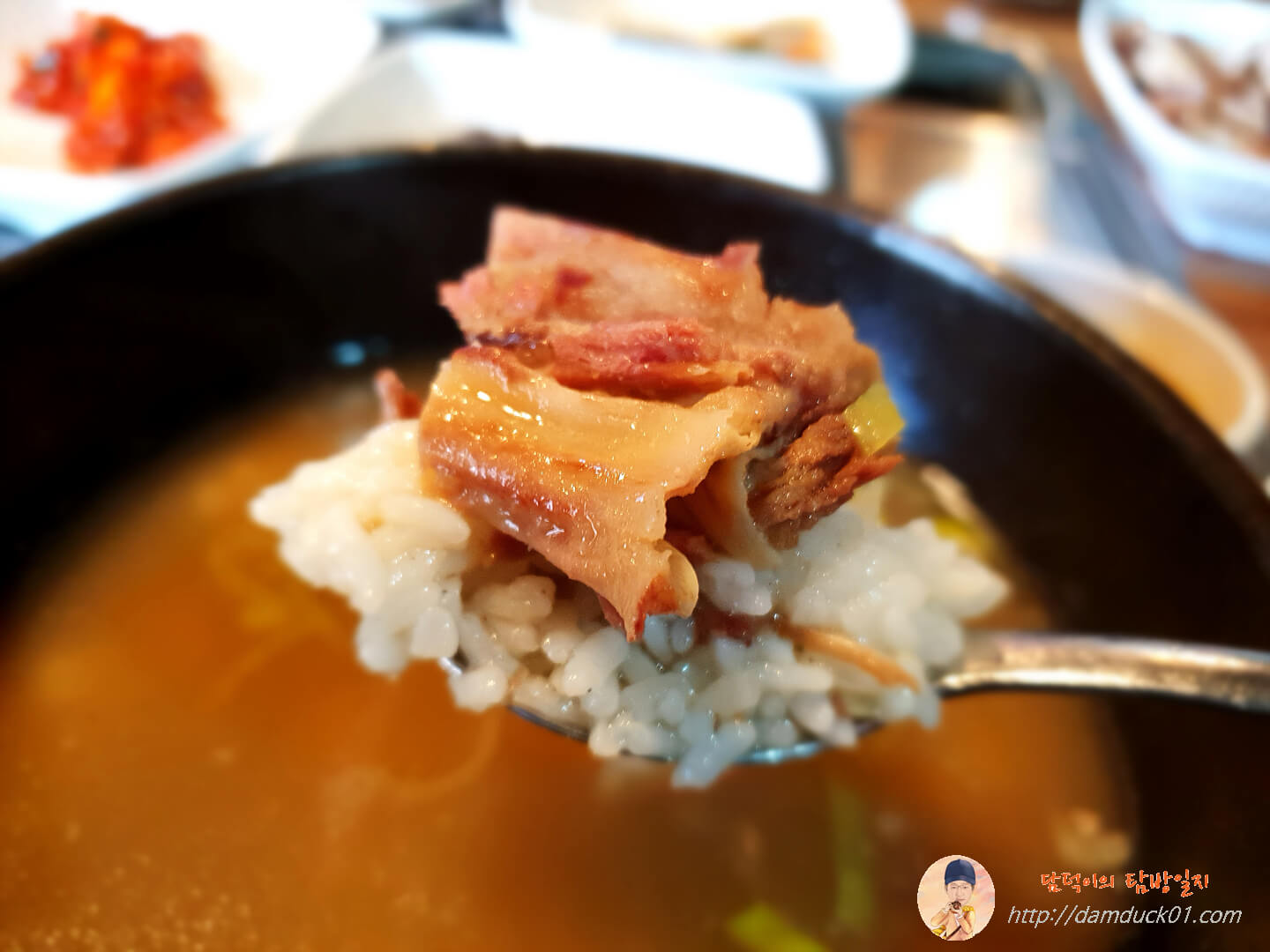 이렇게 갈비 정리가 끝난 후 먼저 갈비탕 국물에 후추를 후추후추 뿌려주고 밥을 그릇 그대로 뒤집어서 퐁당, 후추의 매운맛과 갈비탕의 시원한 국물의 조합은 언제 먹어도 최고죠. 밥을 그대로 떠서 한 입 먹으니 아~ 좋습니다.