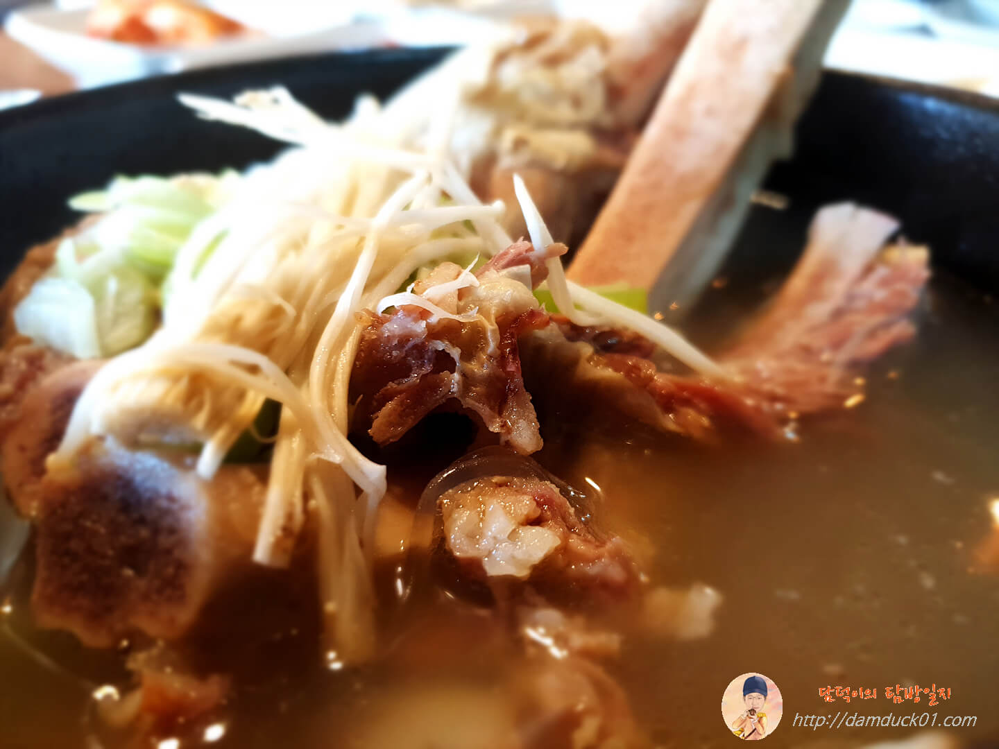 뽀얀 고깃국물에 고기가 많이 붙어 있는 뼈다귀가 무척 마음에 듭니다. 기름 동동 떠 있는 국물과 살짝 보이는 당면이 맛난 갈비탕임을 어필하고 있어요.