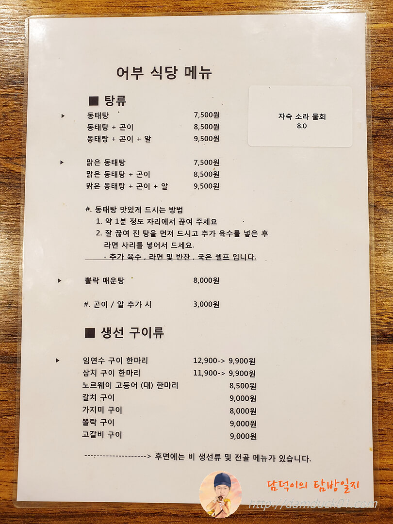 생선 구이류가 여러 종류이긴 하지만 탕은 어차피 동태탕이고 생선 구이만 먹는 경우는 없는 거 같아요.