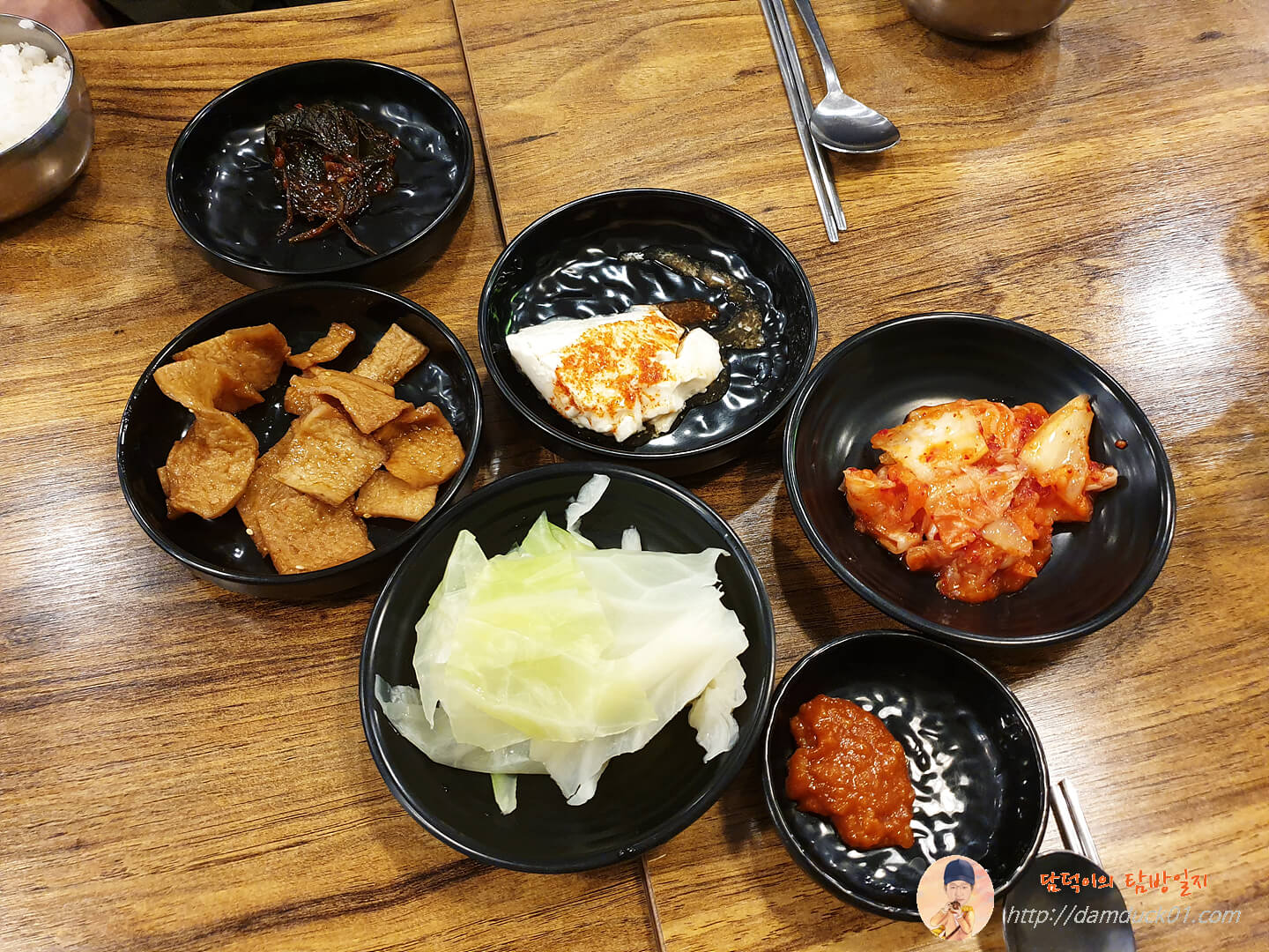 깻잎 장아찌와 순두부, 배추김치, 어묵조림, 양배추와 쌈장까지.