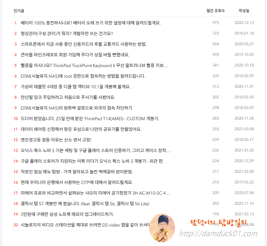 그 외에 새로 인기 글 TOP 20에 진입한 글을 찾아보면 3월 인기 글 19위를 차지한 "3만 원에 구매한 삼성 노트북 메모리 업그레이드하기." 글이 있네요.