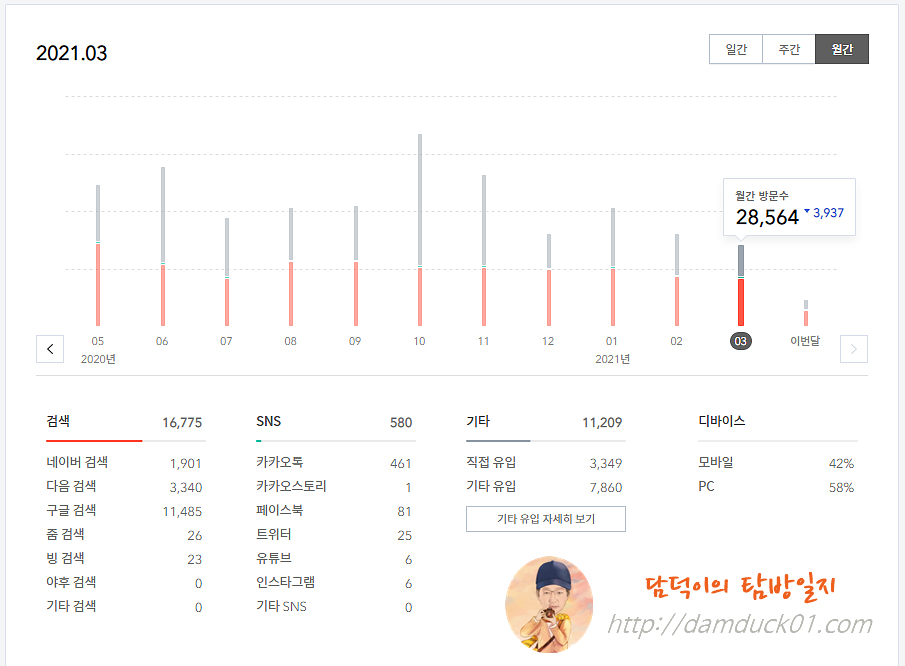 2021년 3월의 절망적인 통계의 이유는 결국 다음 메인 등록 실패와 네이버 검색 유입의 끊임없는 하락, 이 정도로 정리가 되는 거 같아요.