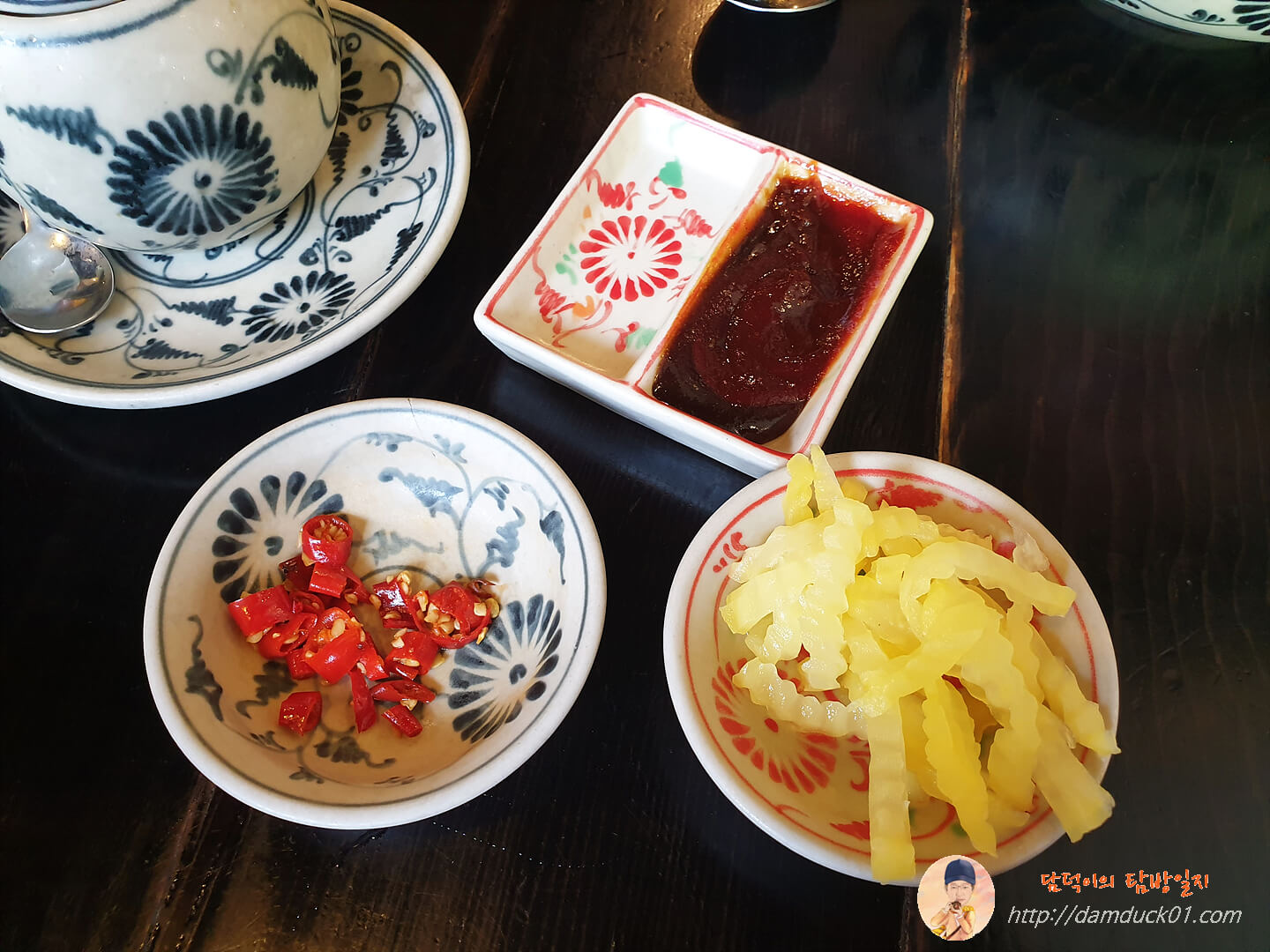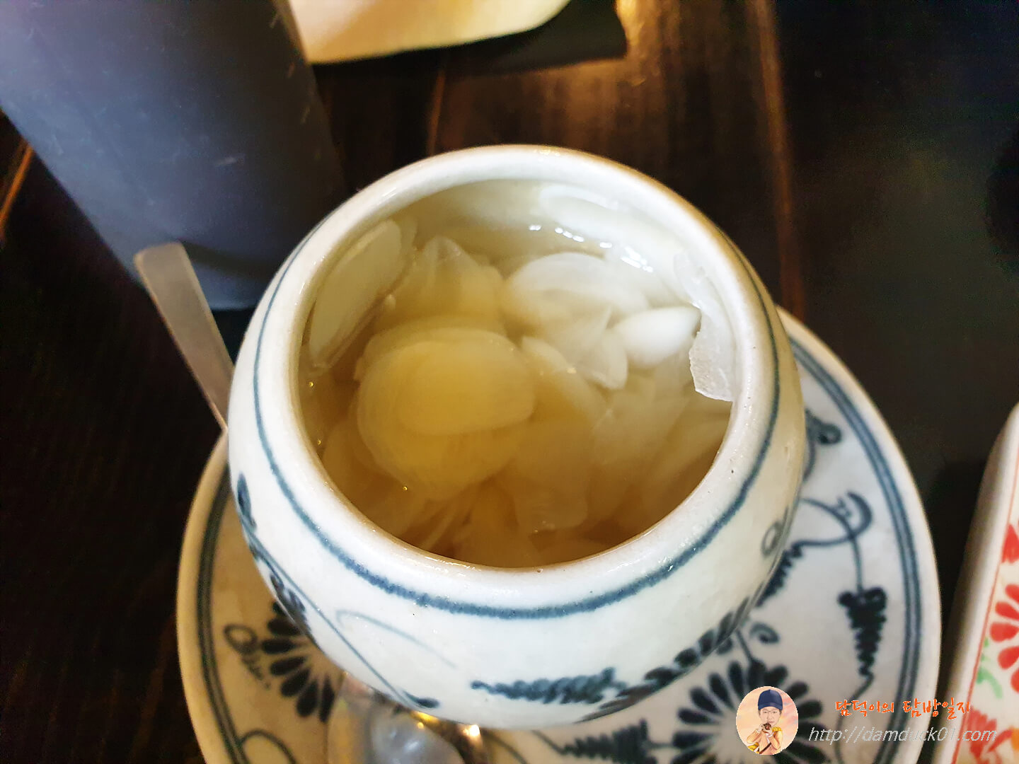뭔가 특이하게 생긴 주전자 같은 그릇이 있어서 뚜껑을 열어봤더니 어라, 얇게 썰은 마늘이 들어 있네요. 쌀국숫집에서 다양하게 썰은 양파는 많이 봤지만 이렇게 마늘이 있는 건 처음 봤어요.