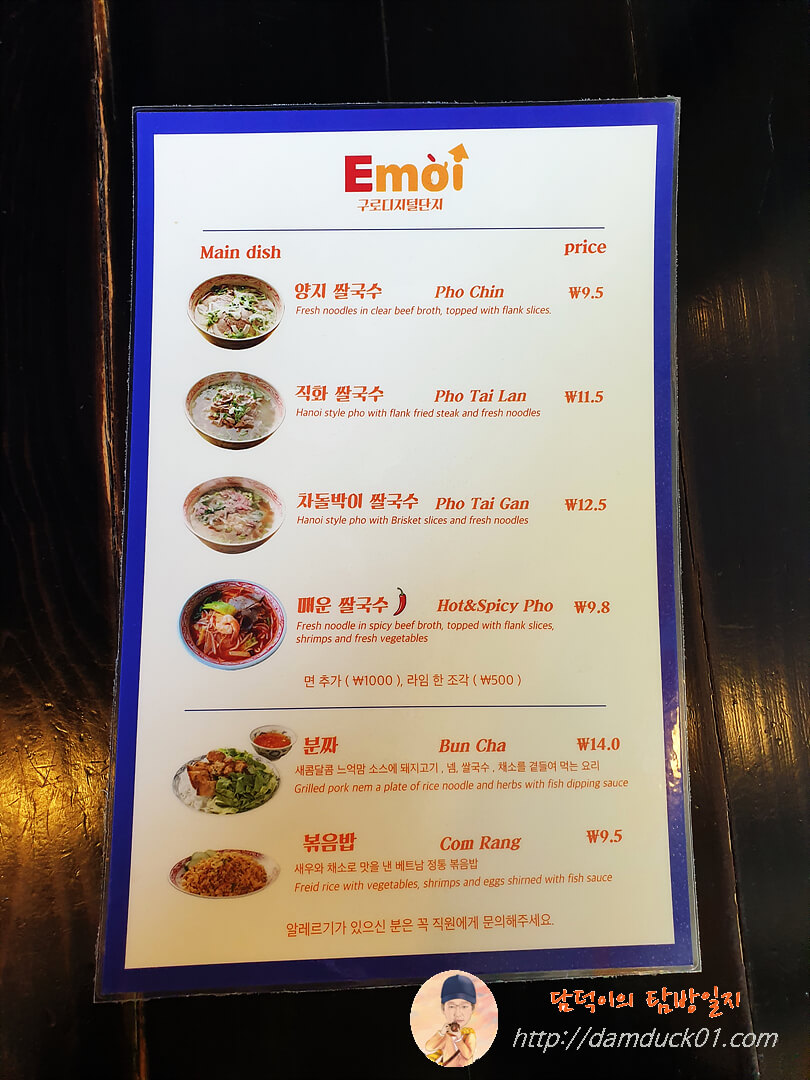 그런데 체인이 다른 걸까요? 로고는 똑같은데 실내 장식은 많이 다르고 메뉴판도 다르고 가격은 오히려 300원이 싸졌어요. 그리고 2019년에 에머이의 평과 어제 먹은 에머이의 평도 많이 다르고요. 솔직히 어제 먹은 에머이의 양지 쌀국수는 별로였거든요. 그동안 제 입맛이 바뀐 건지 에머이 구로점이 별로인 건지 나중에 다른 에머이를 한 번 더 가봐야 알 거 같아요.