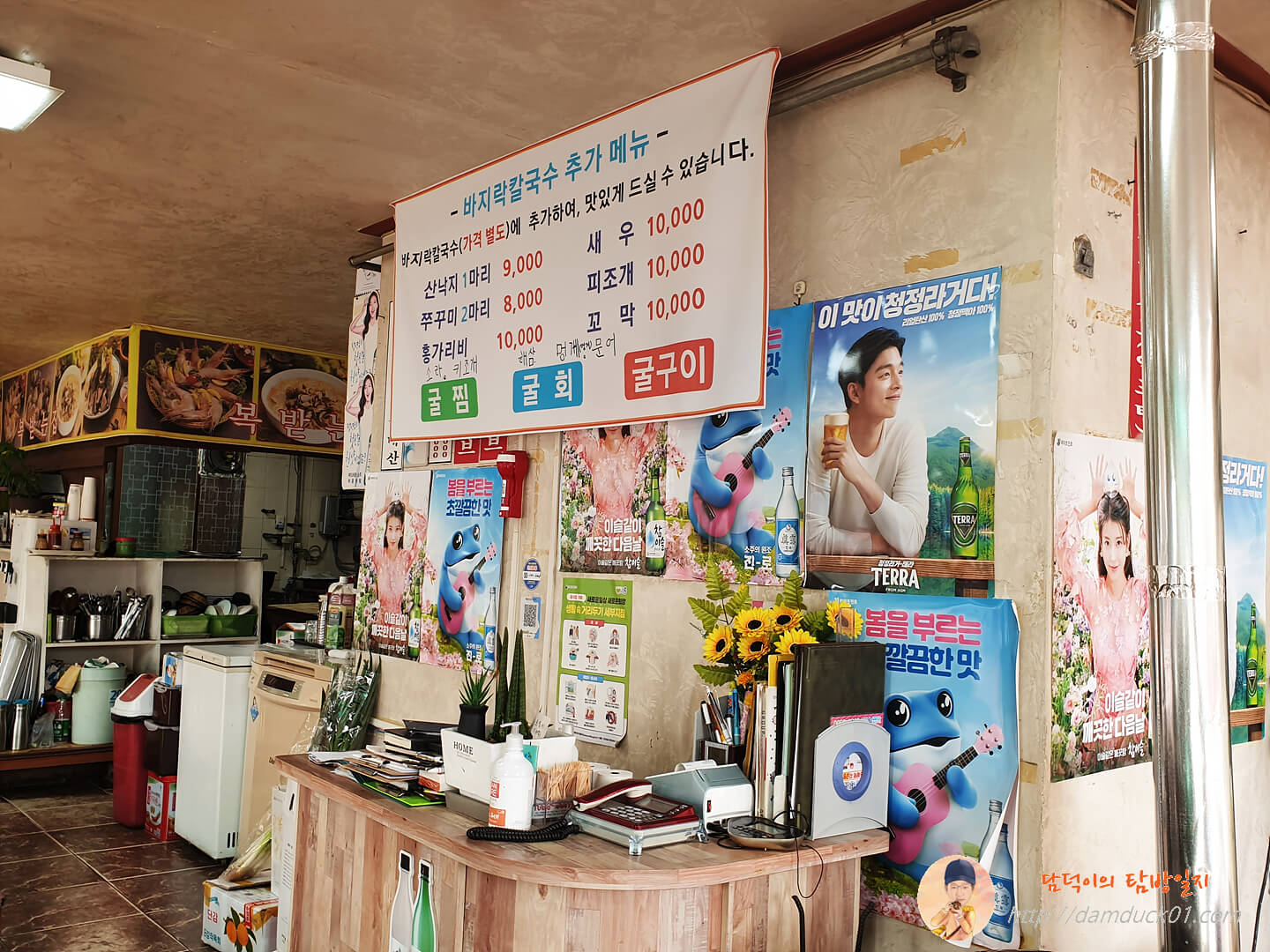 바지락 칼국수를 주문한 경우에는 원하는 해산물을 추가할 수도 있네요. 이런 메뉴 구성은 처음 봅니다. 오~ 좋은 거 같아요. 벽에는 왠지 거울을 보는 거 같은 테라 광고 모델이 있네요.