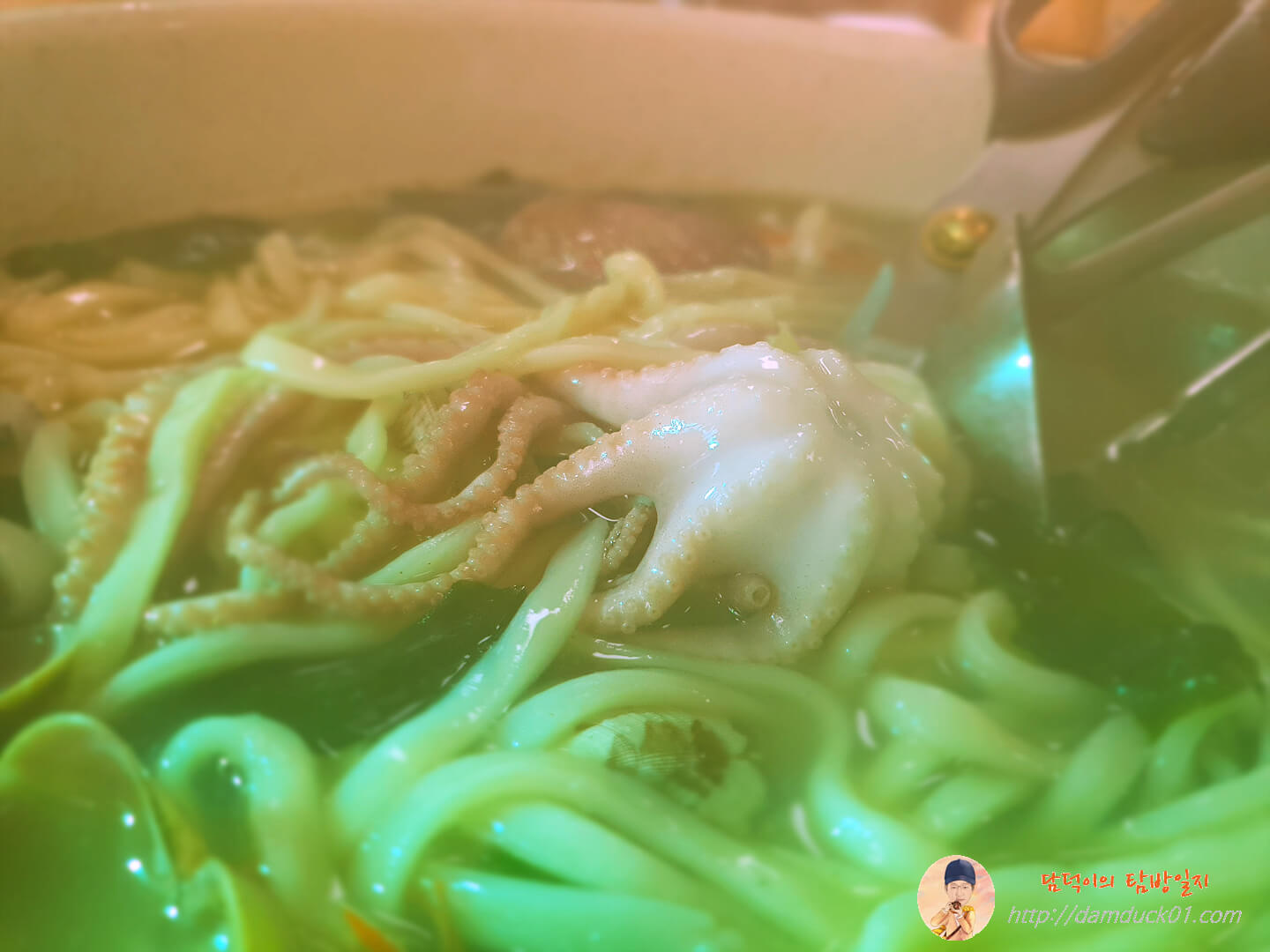 주꾸미도 자르고 낙지도 자르고 배고파하는 아이들 먼저 그릇에 덜어준 후 제가 받은 칼국수 한 그릇입니다. 새우도 있고 주꾸미도 있고 조개도 있어요. 칼국수는 면치기 해주고 새우 머리 톡 끊어 와그작 씹어 먹어주고 국물 후루룩 마셔주면 아~ 좋습니다.