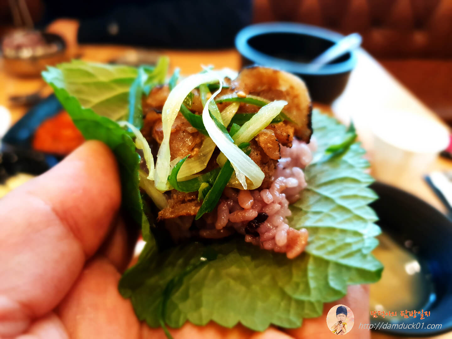 반찬도 맛있고 메인 음식인 숯불고기구이는 그냥 밥이랑 먹어도 맛있고 쌈 채소가 있으니 이렇게 쌈을 싸서 파채 얹어서 먹으면 굳이 쌈장 안 넣어도 맛있더라고요.