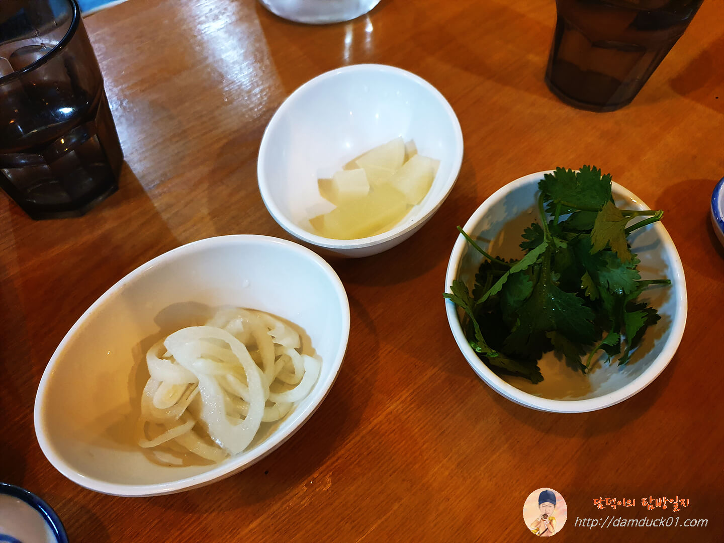 기본 반찬으로는 단무지와 양파가 나오는데요. 고수는 탐방원이 요청을 해서 받았어요. 물론 저는 우리나라에서 굳이 고수를 먹지는 않습니다. ㅋ