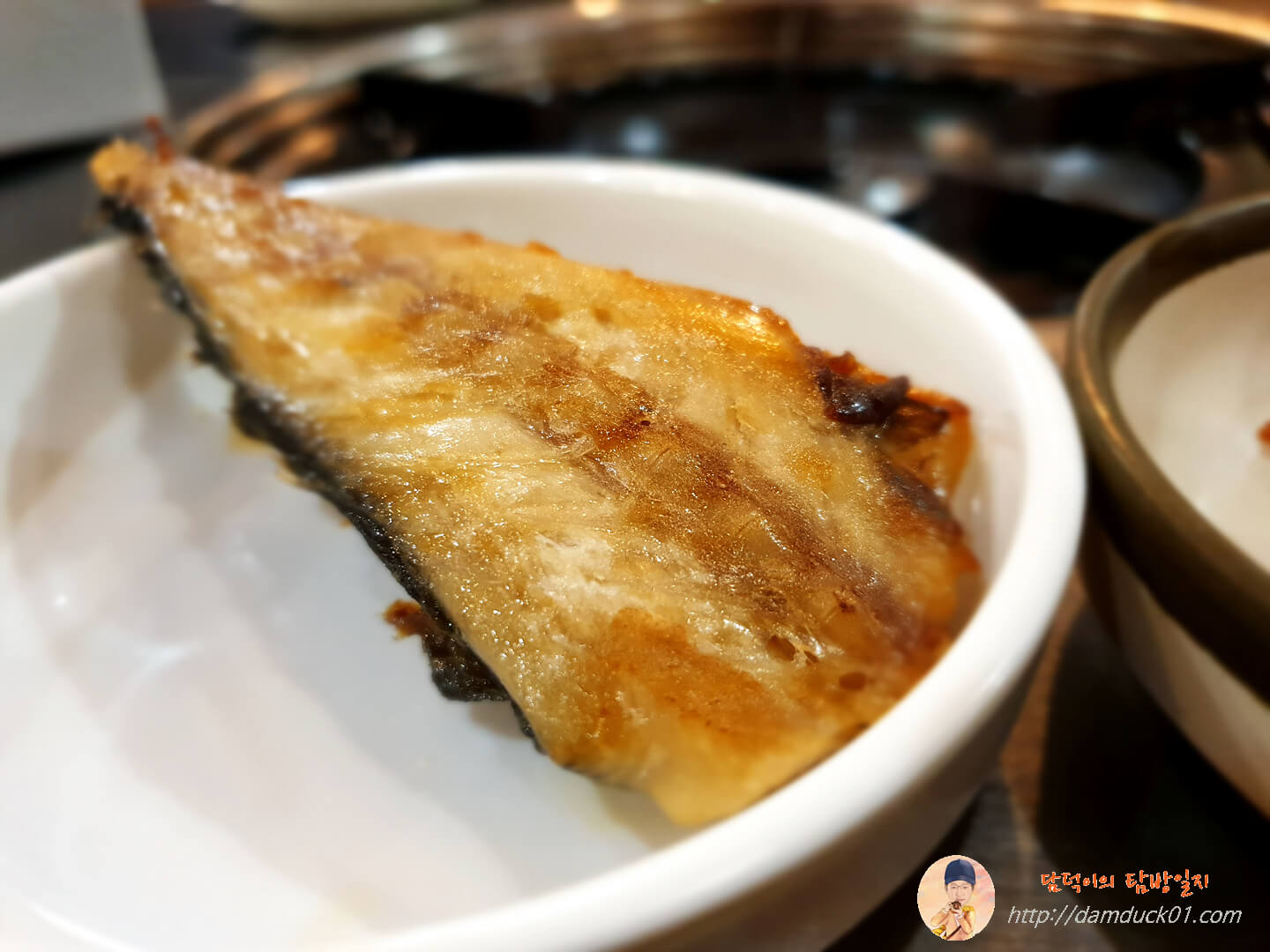 먼저 생선구이와 기본 반찬이 나왔습니다. 반찬은 볶음 김치와 동그랑땡 그리고 버섯이 나왔어요.