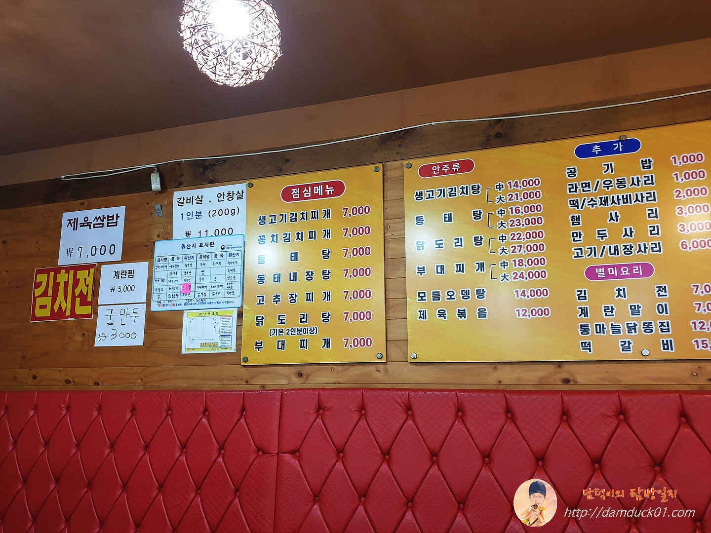 들어가서 메뉴판을 살펴보면 점심 메뉴가 이렇게 총 7개 종류가 있는데 찌개 정식이라는 메뉴가 보이지 않습니다. 찌개 정식은 따로 결정(?)되어 있는 메뉴가 아니라 저 7가지의 점심 메뉴 중 아무거나 주문하면 찌개 정식 구성 즉 주문한 찌개 + 생선구이 + 제육볶음이 나온다는 거죠. 저와 탐방원들은 생고기 김치찌개로 주문을 했습니다.
