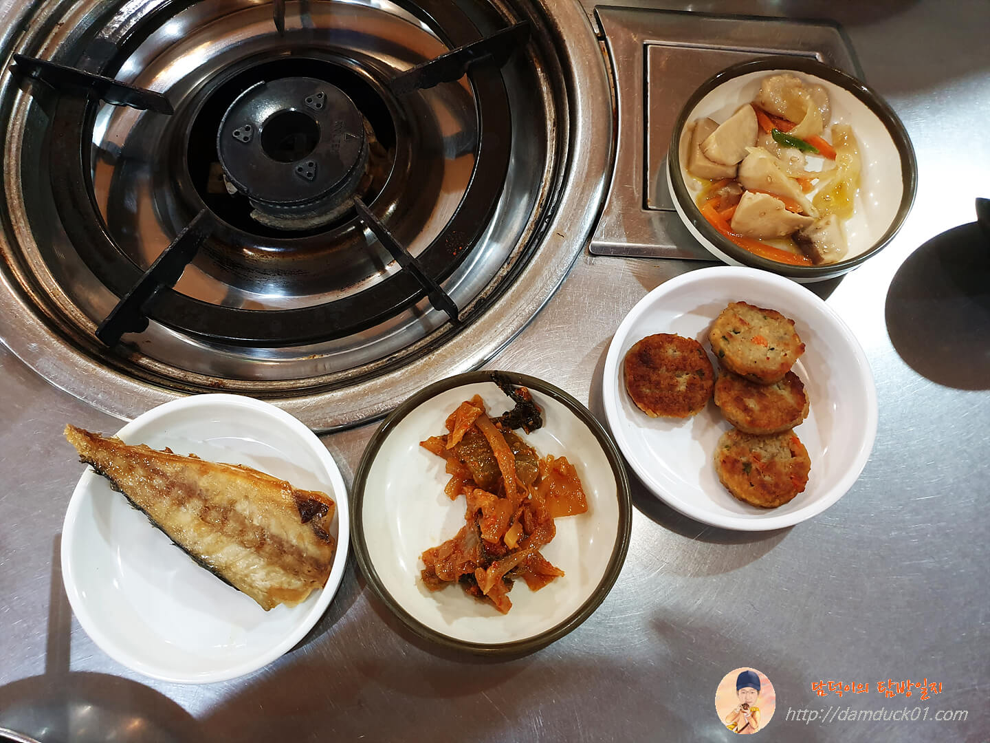 먼저 생선구이와 기본 반찬이 나왔습니다. 반찬은 볶음 김치와 동그랑땡 그리고 버섯이 나왔어요.