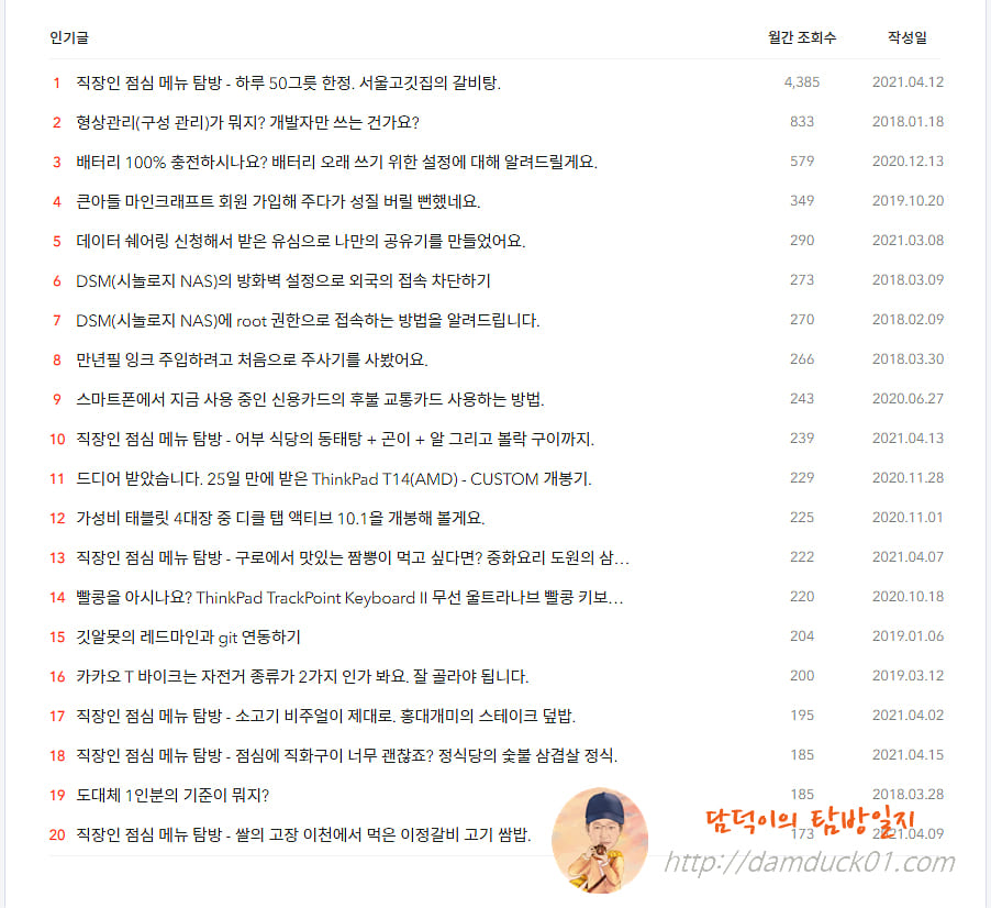 4월 인기 글 순위는 1위를 제외하면 2위 3위는 3월 1위 2위가 순위만 바뀐 결과가 나왔네요. 월간 조회 수의 폭이 꽤 크게 차이가 난 편이고요.