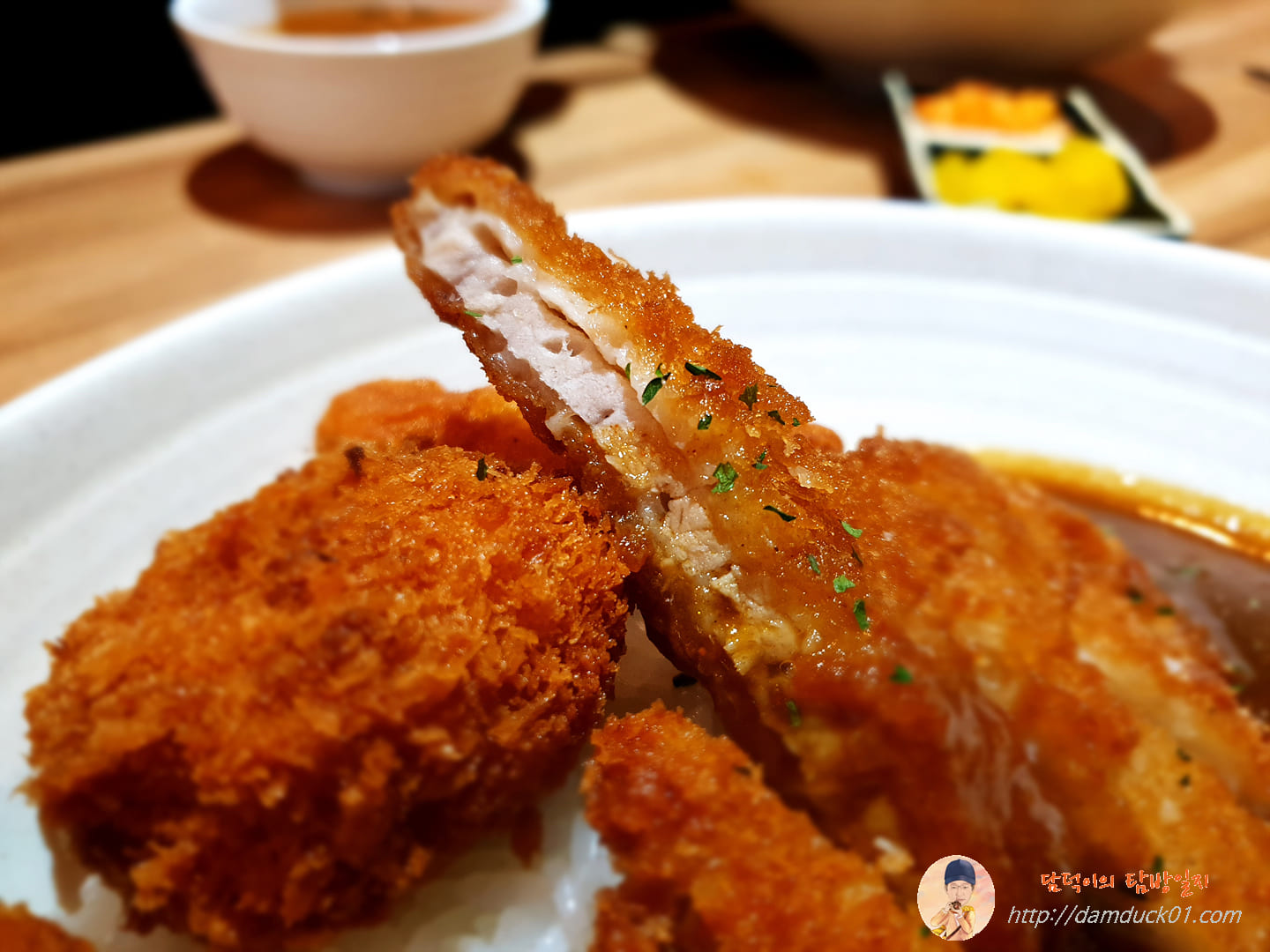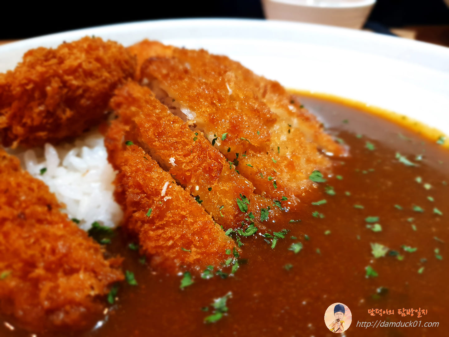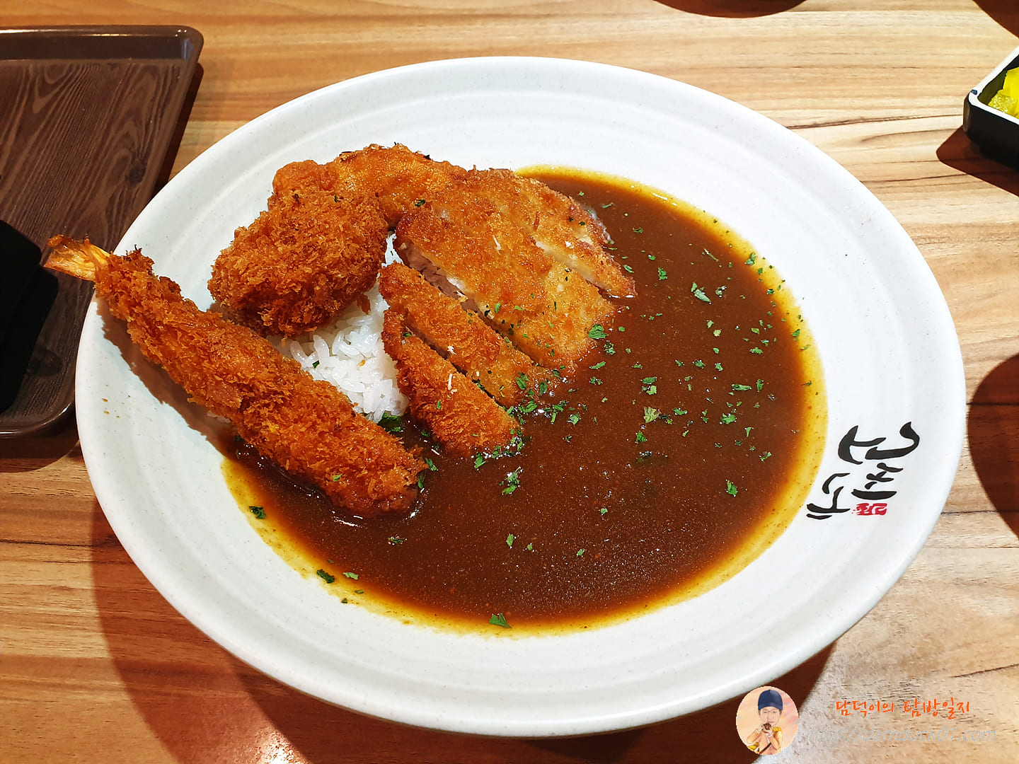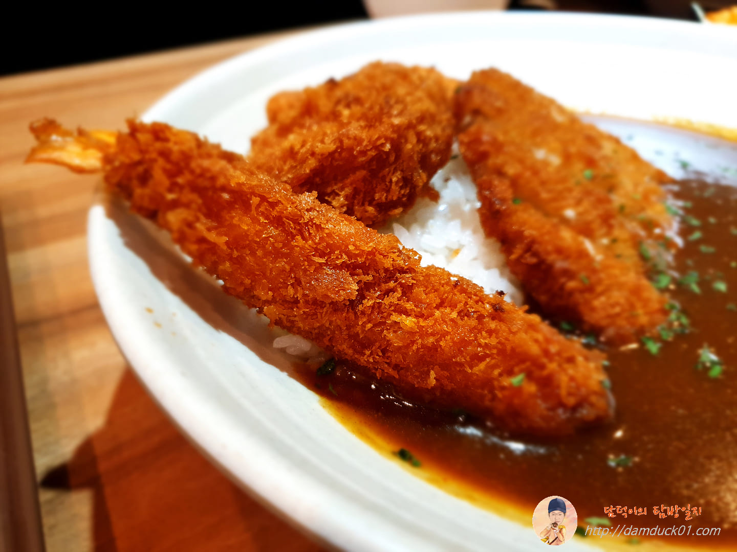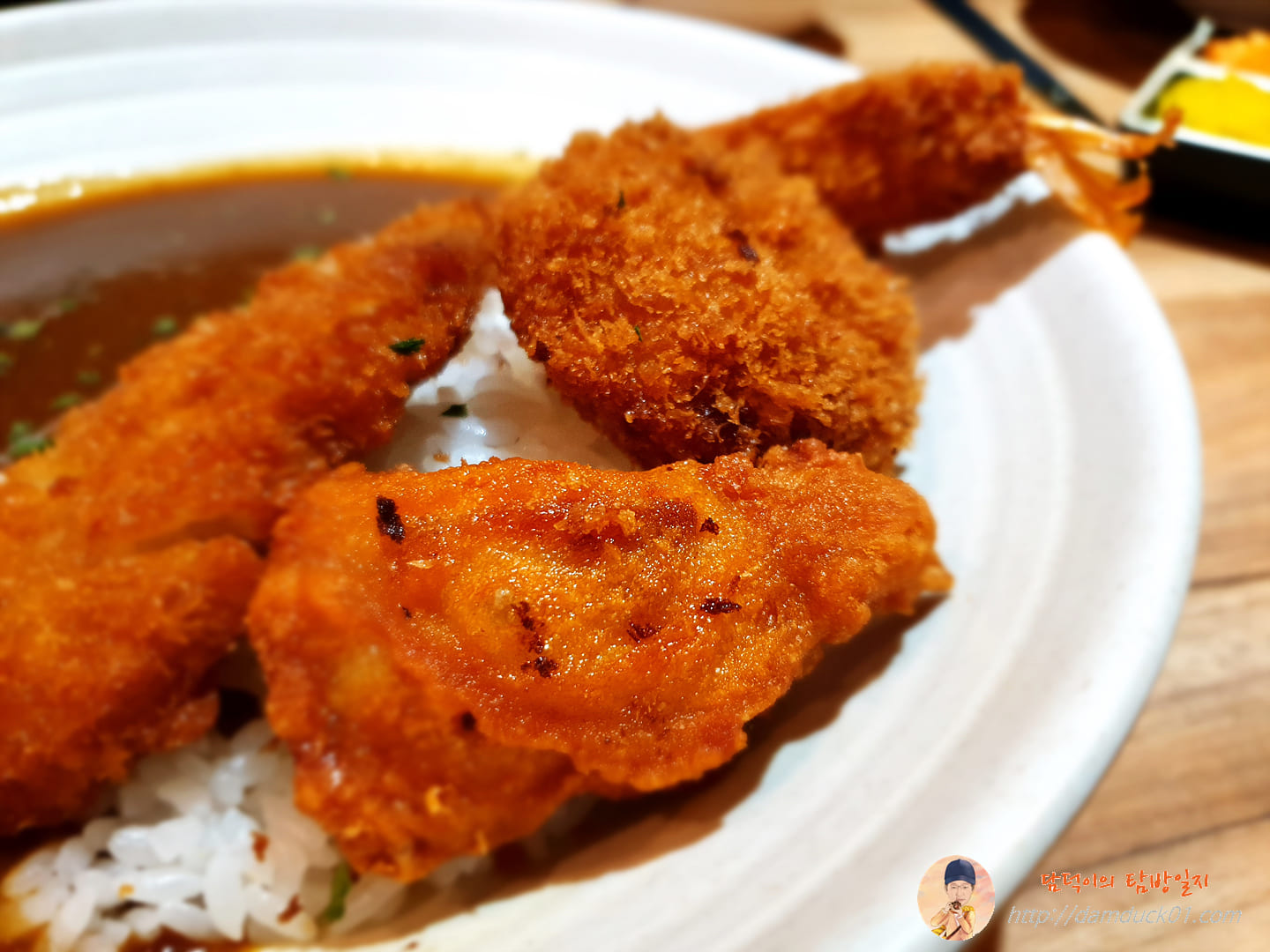 새우튀김은 카레에 머리를 살짝 담그고 있네요.