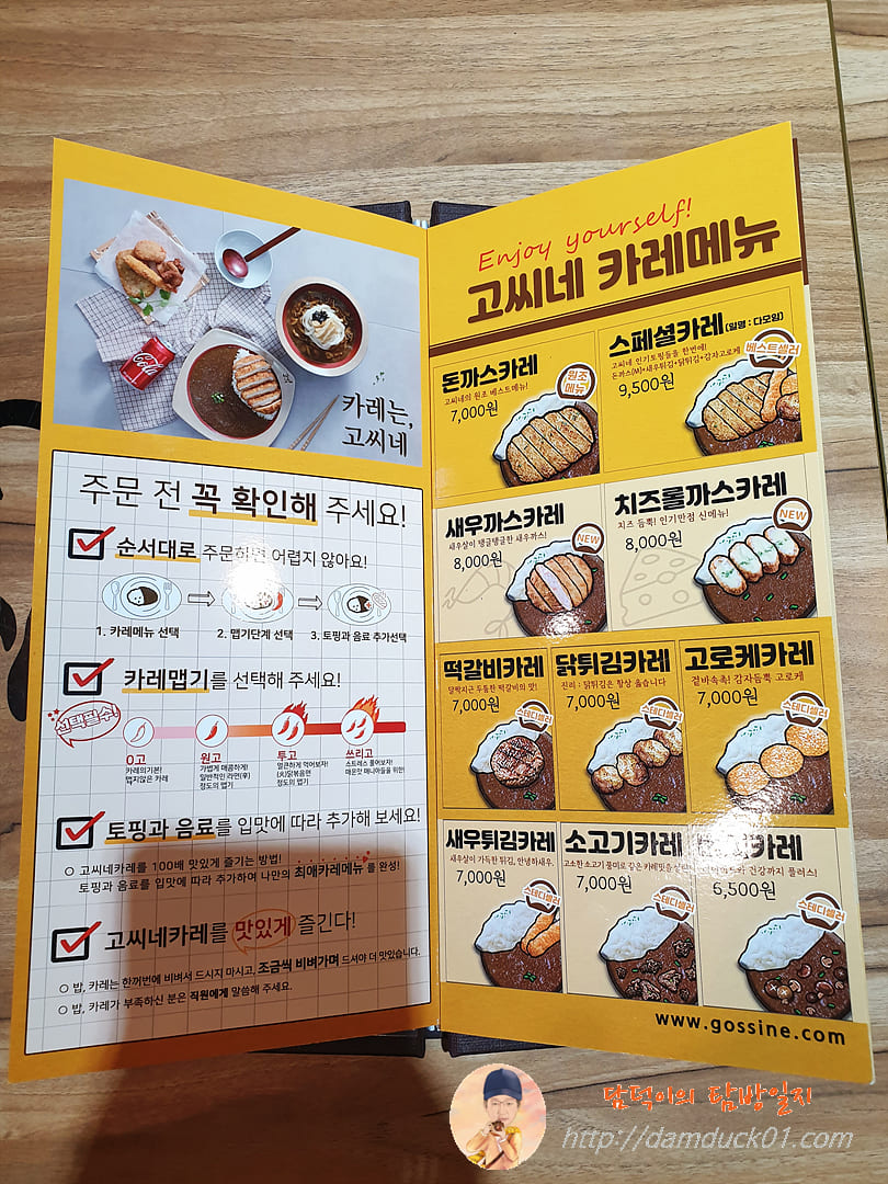 고씨네 메뉴판은 이렇게 되어 있습니다. 좌측에 주문 방법이 우측에 다양한 카레 메뉴가 있고 뒤편에는 추가할 토핑 가격이 나와 있어요. 처음 왔으니까 여러 가지 다 맛보기 위해서 스페셜 카레를 주문했고 카레 맵기는 투고로 주문했어요.