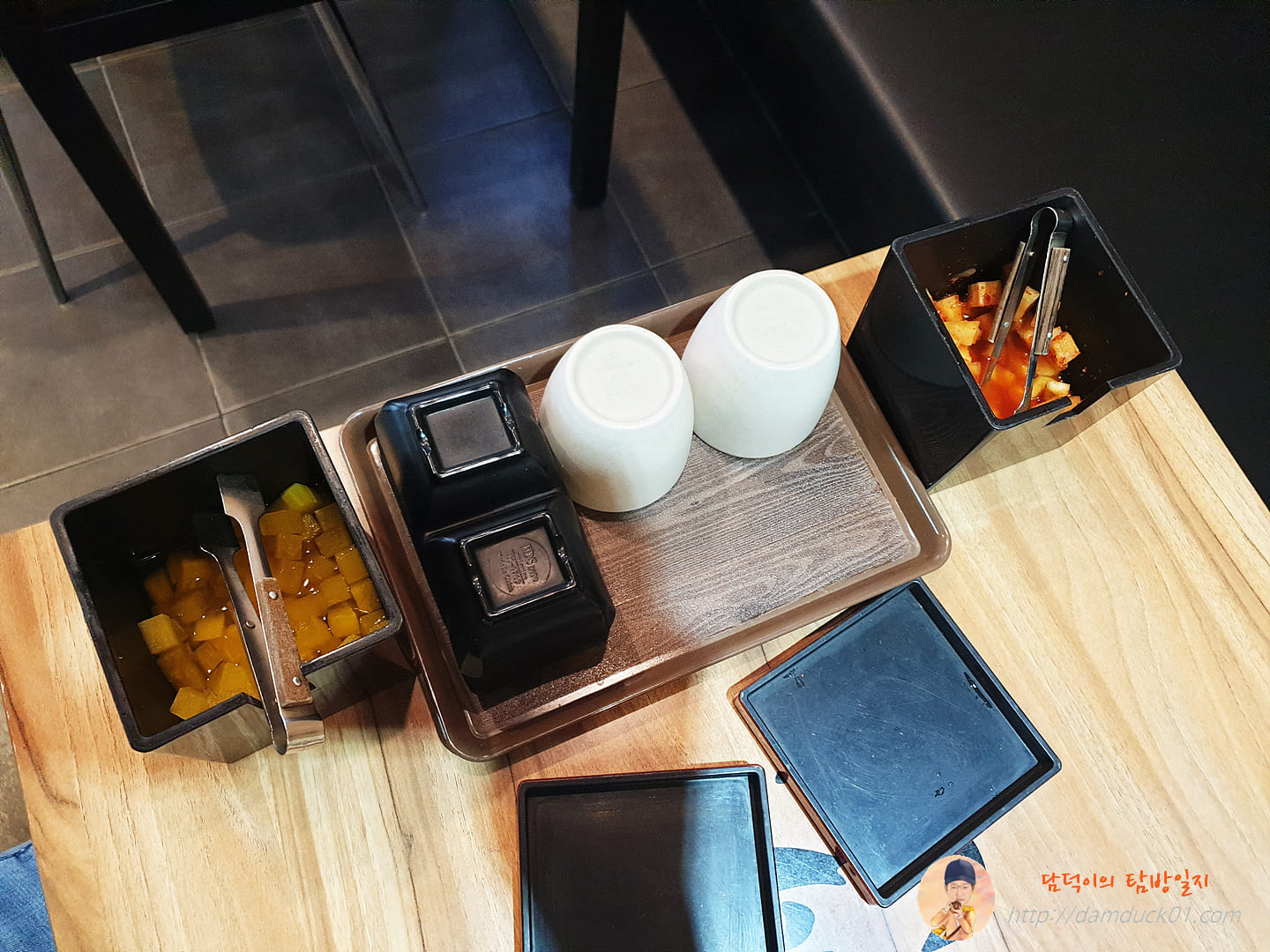 반찬은 테이블에 준비되어 있는 작은 단무지와 작은 깍두기가 있네요. 작은 반찬 그릇에 두 가지 반찬을 덜어 놓으면 준비 끝입니다.